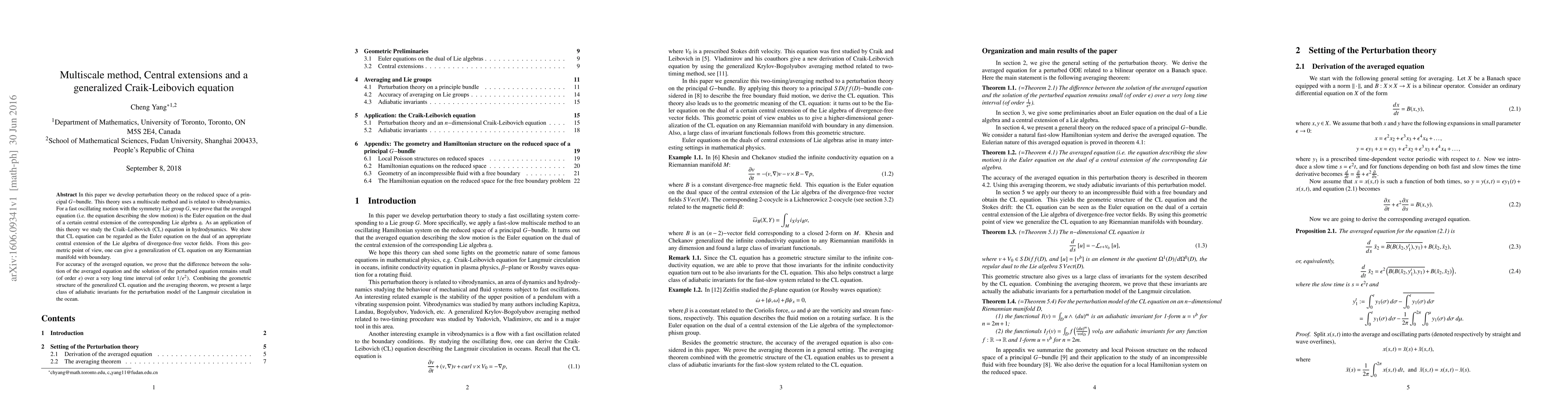 In this paper we develop perturbation theory on the reduced space of a principal $G-$bundle. This theory uses a multiscale method and is related to vibrodynamics. For a fast oscillating motion with the symmetry Lie group $G$, we prove that the averaged equation (i.e. the equation describing the slow motion) is the Euler equation on the dual of a certain central extension of the corresponding Lie algebra $\mathfrak g$. As an application of this theory we study the Craik--Leibovich (CL) equation in hydrodynamics. We show that CL equation can be regarded as the Euler equation on the dual of an appropriate central extension of the Lie algebra of divergence-free vector fields. From this geometric point of view, one can give a generalization of CL equation on any Riemannian manifold with boundary. For accuracy of the averaged equation, we prove that the difference between the solution of the averaged equation and the solution of the perturbed equation remains small (of order $\epsilon$) over a very long time interval (of order $1/{\epsilon^2}$). Combining the geometric structure of the generalized CL equation and the averaging theorem, we present a large class of adiabatic invariants for the perturbation model of the Langmuir circulation in the ocean.