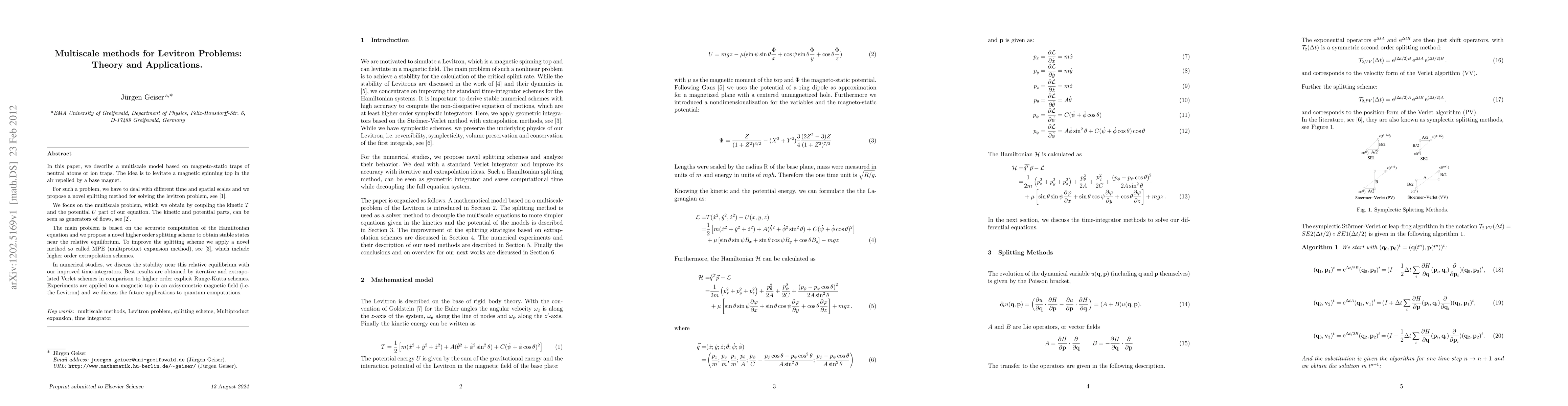In this paper, we describe a multiscale model based on magneto-static traps of neutral atoms or ion traps. The idea is to levitate a magnetic spinning top in the air repelled by a base magnet. For such a problem, we have to deal with different time and spatial scales and we propose a novel splitting method for solving the levitron problem. We focus on the multiscale problem, which we obtain by coupling the kinetic T and the potential U part of our equation. The kinetic and potential parts, can be seen as generators of flows. The main problem is based on the accurate computation of the Hamiltonian equation and we propose a novel higher order splitting scheme to obtain stable states near the relative equilibrium. To improve the splitting scheme we apply a novel method so called MPE (multiproduct expansion method), which include higher order extrapolation schemes. In numerical studies, we discuss the stability near this relative equilibrium with our improved time-integrators. Best results are obtained by iterative and extrapolated Verlet schemes in comparison to higher order explicit Runge-Kutta schemes. Experiments are applied to a magnetic top in an axisymmetric magnetic field (i.e. the Levitron) and we discuss the future applications to quantum computations.