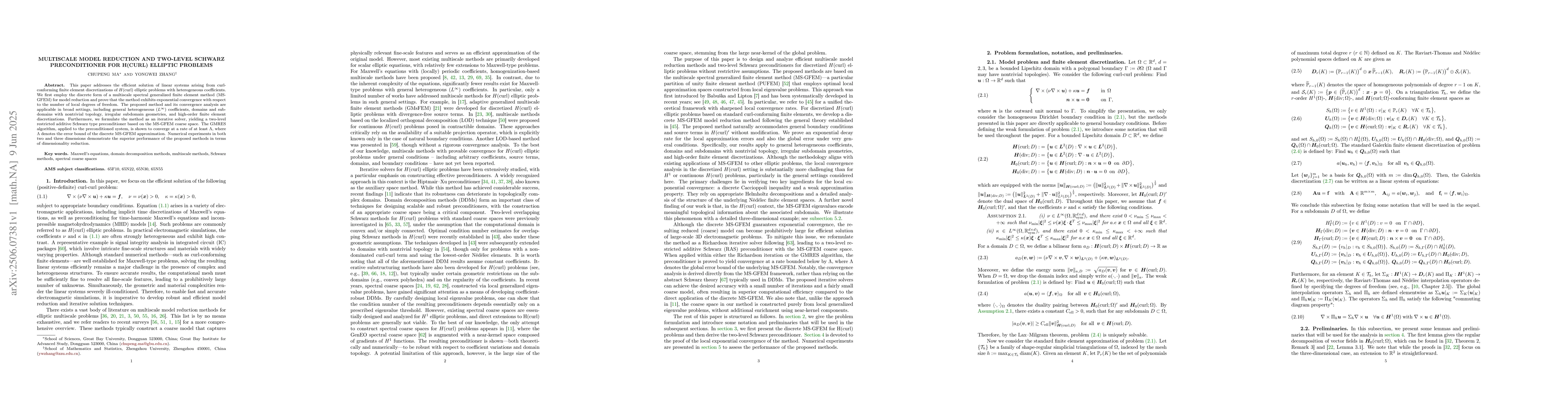 This paper addresses the efficient solution of linear systems arising from curl-conforming finite element discretizations of $H(\mathrm{curl})$ elliptic problems with heterogeneous coefficients. We first employ the discrete form of a multiscale spectral generalized finite element method (MS-GFEM) for model reduction and prove that the method exhibits exponential convergence with respect to the number of local degrees of freedom. The proposed method and its convergence analysis are applicable in broad settings, including general heterogeneous ($L^{\infty}$) coefficients, domains and subdomains with nontrivial topology, irregular subdomain geometries, and high-order finite element discretizations. Furthermore, we formulate the method as an iterative solver, yielding a two-level restricted additive Schwarz type preconditioner based on the MS-GFEM coarse space. The GMRES algorithm, applied to the preconditioned system, is shown to converge at a rate of at least $\Lambda$, where $\Lambda$ denotes the error bound of the discrete MS-GFEM approximation. Numerical experiments in both two and three dimensions demonstrate the superior performance of the proposed methods in terms of dimensionality reduction.