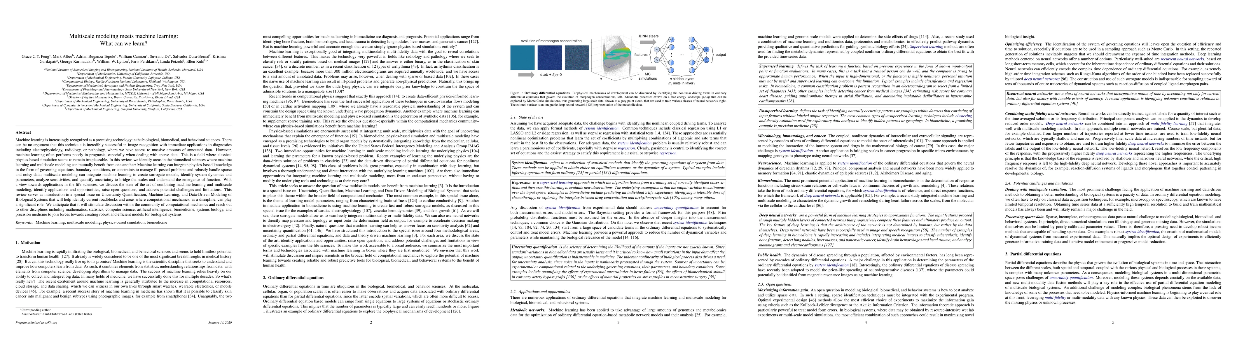 Machine learning is increasingly recognized as a promising technology in the biological, biomedical, and behavioral sciences. There can be no argument that this technique is incredibly successful in image recognition with immediate applications in diagnostics including electrophysiology, radiology, or pathology, where we have access to massive amounts of annotated data. However, machine learning often performs poorly in prognosis, especially when dealing with sparse data. This is a field where classical physics-based simulation seems to remain irreplaceable. In this review, we identify areas in the biomedical sciences where machine learning and multiscale modeling can mutually benefit from one another: Machine learning can integrate physics-based knowledge in the form of governing equations, boundary conditions, or constraints to manage ill-posted problems and robustly handle sparse and noisy data; multiscale modeling can integrate machine learning to create surrogate models, identify system dynamics and parameters, analyze sensitivities, and quantify uncertainty to bridge the scales and understand the emergence of function. With a view towards applications in the life sciences, we discuss the state of the art of combining machine learning and multiscale modeling, identify applications and opportunities, raise open questions, and address potential challenges and limitations. We anticipate that it will stimulate discussion within the community of computational mechanics and reach out to other disciplines including mathematics, statistics, computer science, artificial intelligence, biomedicine, systems biology, and precision medicine to join forces towards creating robust and efficient models for biological systems.