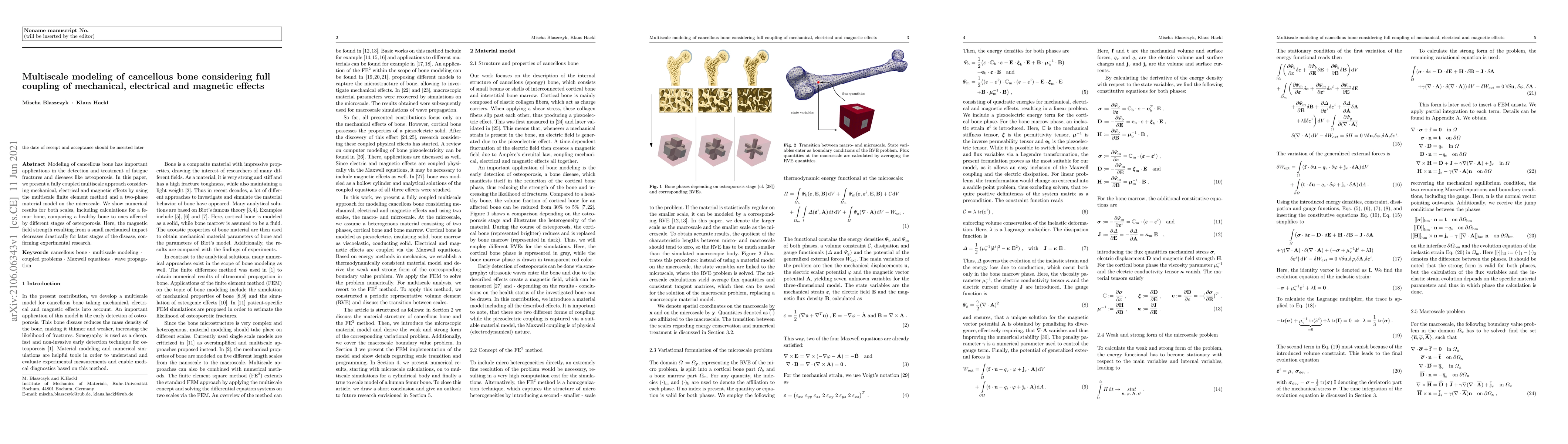 Modeling of cancellous bone has important applications in the detection and treatment of fatigue fractures and diseases like osteoporosis. In this paper, we present a fully coupled multiscale approach considering mechanical, electrical and magnetic effects by using the multiscale finite element method and a two-phase material model on the microscale. We show numerical results for both scales, including calculations for a femur bone, comparing a healthy bone to ones affected by different stages of osteoporosis. Here, the magnetic field strength resulting from a small mechanical impact decreases drastically for later stages of the disease, confirming experimental research.