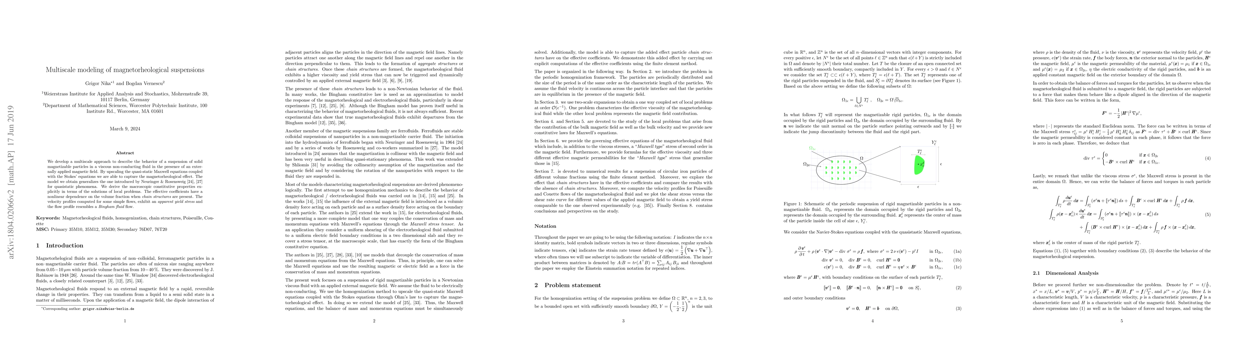 We develop a multiscale approach to describe the behavior of a suspension of solid magnetizable particles in a viscous non-conducting fluid in the presence of an externally applied magnetic field. By upscaling the quasi-static Maxwell equations coupled with the Stokes' equations we are able to capture the magnetorheological effect. The model we obtain generalizes the one introduced by Neuringer & Rosensweig for quasistatic phenomena. We derive the macroscopic constitutive properties explicitly in terms of the solutions of local problems. The effective coefficients have a nonlinear dependence on the volume fraction when chain structures are present. The velocity profiles computed for some simple flows, exhibit an apparent yield stress and the flow profile resembles a Bingham fluid flow.