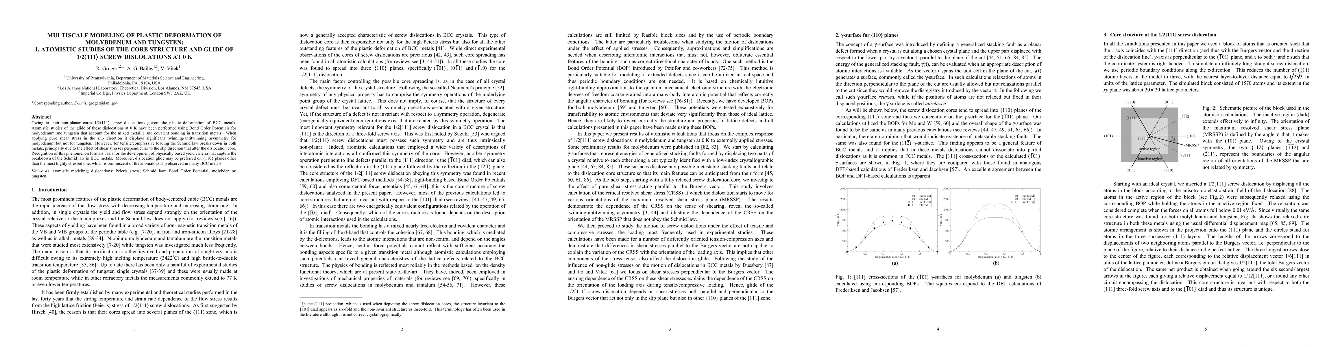 This paper investigates the atomic-level behavior of 1/2<111> screw dislocations in molybdenum and tungsten at 0 K, revealing significant differences in their plastic deformation mechanisms. The study finds that while molybdenum exhibits twinning-antitwinning asymmetry under shear stress, tungsten does not, and both metals show a breakdown of the Schmid law under tensile/compressive loading due to shear stresses affecting dislocation cores.
