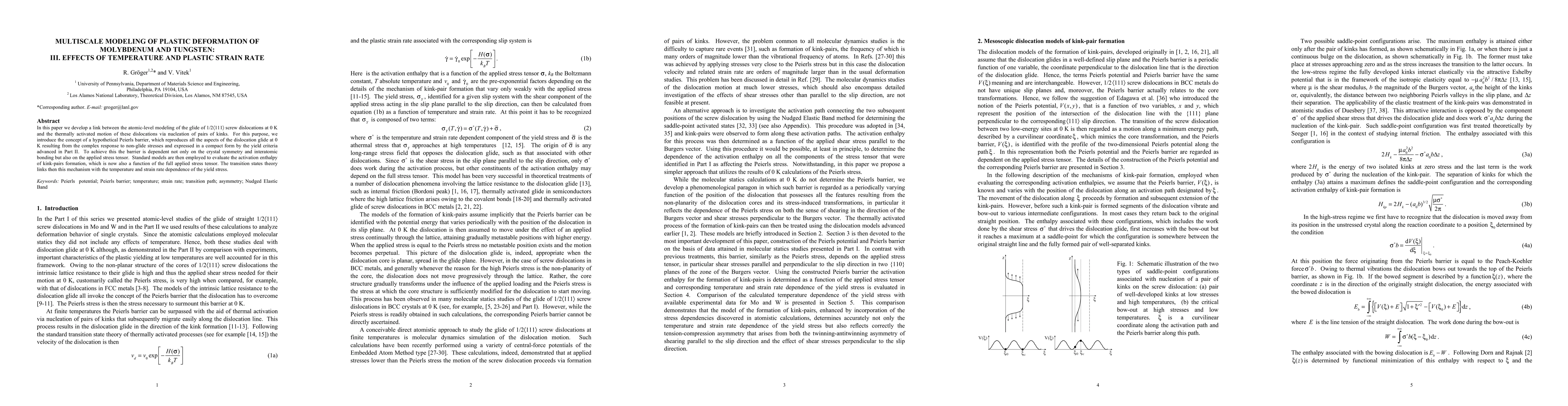 This paper bridges atomic-level dislocation glide at 0K with thermally activated dislocation motion via kink-pair nucleation, using a hypothetical Peierls barrier dependent on crystal symmetry, interatomic bonding, and applied stress tensor. It calculates activation enthalpy for kink-pair formation and links this to temperature and strain rate effects on yield stress through transition state theory.