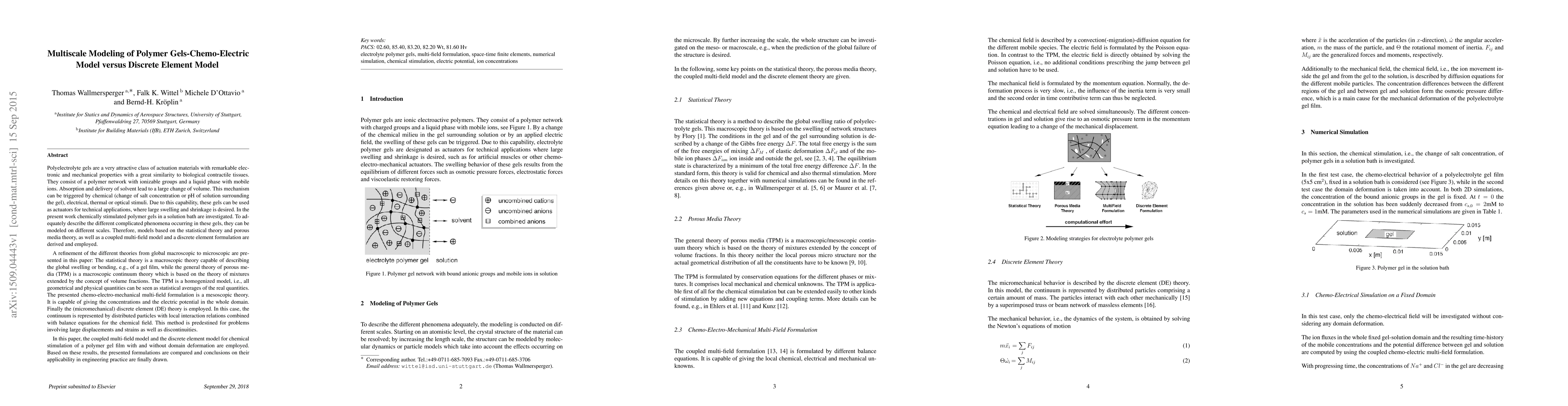 Polyelectrolyte gels are a very attractive class of actuation materials with remarkable electronic and mechanical properties with a great similarity to biological contractile tissues. They consist of a polymer network with ionizable groups and a liquid phase with mobile ions. Absorption and delivery of solvent lead to a large change of volume. This mechanism can be triggered by chemical (change of salt concentration or pH of solution surrounding the gel), electrical, thermal or optical stimuli. Due to this capability, these gels can be used as actuators for technical applications, where large swelling and shrinkage is desired. In the present work chemically stimulated polymer gels in a solution bath are investigated. To adequately describe the different complicated phenomena occurring in these gels, they can be modeled on different scales. Therefore, models based on the statistical theory and porous media theory, as well as a coupled multi-field model and a discrete element formulation are derived and employed. In this paper, the coupled multi-field model and the discrete element model for chemical stimulation of a polymer gel film with and without domain deformation are employed. Based on these results, the presented formulations are compared and conclusions on their applicability in engineering practice are finally drawn.