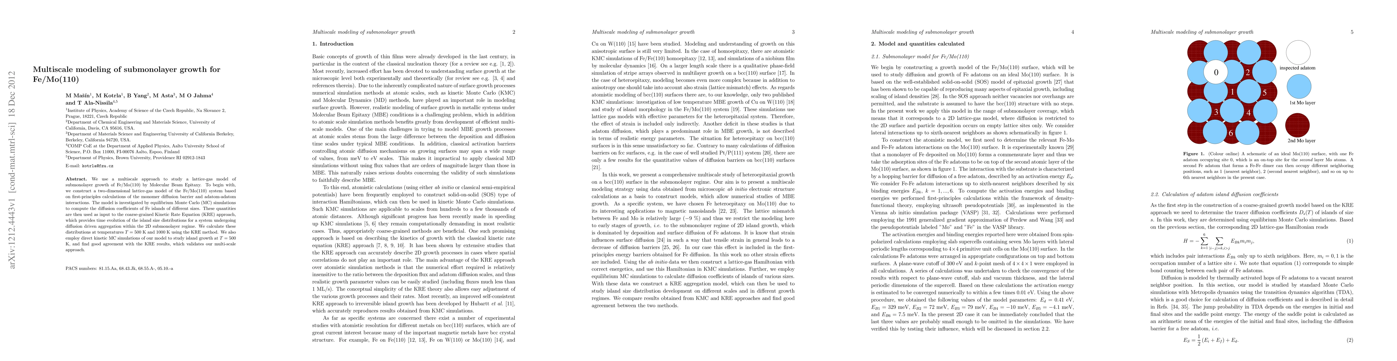 This paper employs a multiscale modeling approach to study the submonolayer growth of Fe on Mo(110) using Molecular Beam Epitaxy. It combines lattice-gas models, equilibrium Monte Carlo simulations, and Kinetic Rate Equations to predict island size distributions at 500 K and 1000 K, validating the approach with direct kinetic Monte Carlo simulations.
