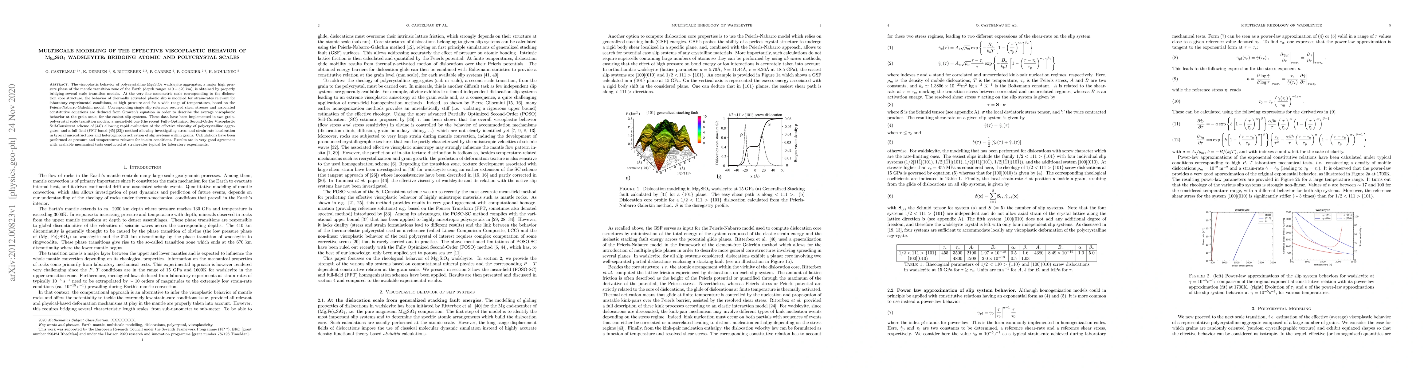The viscoplastic behavior of polycrystalline Mg$_2$SiO$_4$ wadsleyite aggregates, a major high pressure phase of the mantle transition zone of the Earth (depth range: 410 -- 520 km), is obtained by properly bridging several scale transition models. At the very fine nanometric scale corresponding to the disloca-tion core structure, the behavior of thermally activated plastic slip is modeled for strain-rates relevant for laboratory experimental conditions, at high pressure and for a wide range of temperatures, based on the Peierls-Nabarro-Galerkin model. Corresponding single slip reference resolved shear stresses and associated constitutive equations are deduced from Orowan's equation in order to describe the average viscoplastic behavior at the grain scale, for the easiest slip systems. These data have been implemented in two grain-polycrystal scale transition models, a mean-field one (the recent Fully-Optimized Second-Order Viscoplastic Self-Consistent scheme of [44]) allowing rapid evaluation of the effective viscosity of polycrystalline aggregates , and a full-field (FFT based [45] [33]) method allowing investigating stress and strain-rate localization in typical microstructures and heterogeneous activation of slip systems within grains. Calculations have been performed at pressure and temperatures relevant for in-situ conditions. Results are in very good agreement with available mechanical tests conducted at strain-rates typical for laboratory experiments.