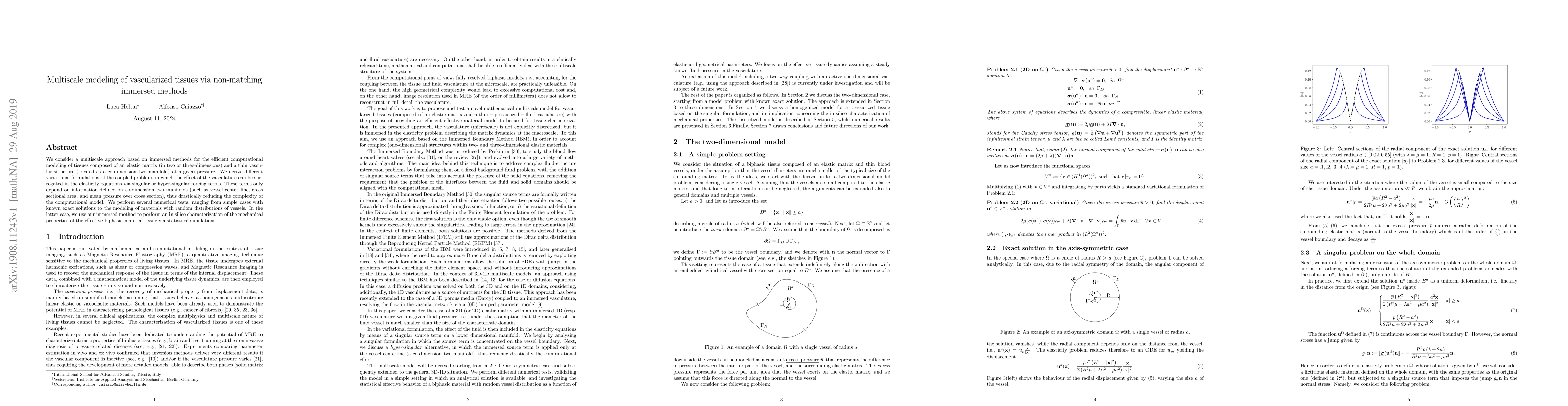 We consider a multiscale approach based on immersed methods for the efficient computational modeling of tissues composed of an elastic matrix (in two or three-dimensions) and a thin vascular structure (treated as a co-dimension two manifold) at a given pressure. We derive different variational formulations of the coupled problem, in which the effect of the vasculature can be surrogated in the elasticity equations via singular or hyper-singular forcing terms. These terms only depend on information defined on co-dimension two manifolds (such as vessel center line, cross sectional area, and mean pressure over cross section), thus drastically reducing the complexity of the computational model. We perform several numerical tests, ranging from simple cases with known exact solutions to the modeling of materials with random distributions of vessels. In the latter case, we use our immersed method to perform an in silico characterization of the mechanical properties of the effective biphasic material tissue via statistical simulations.