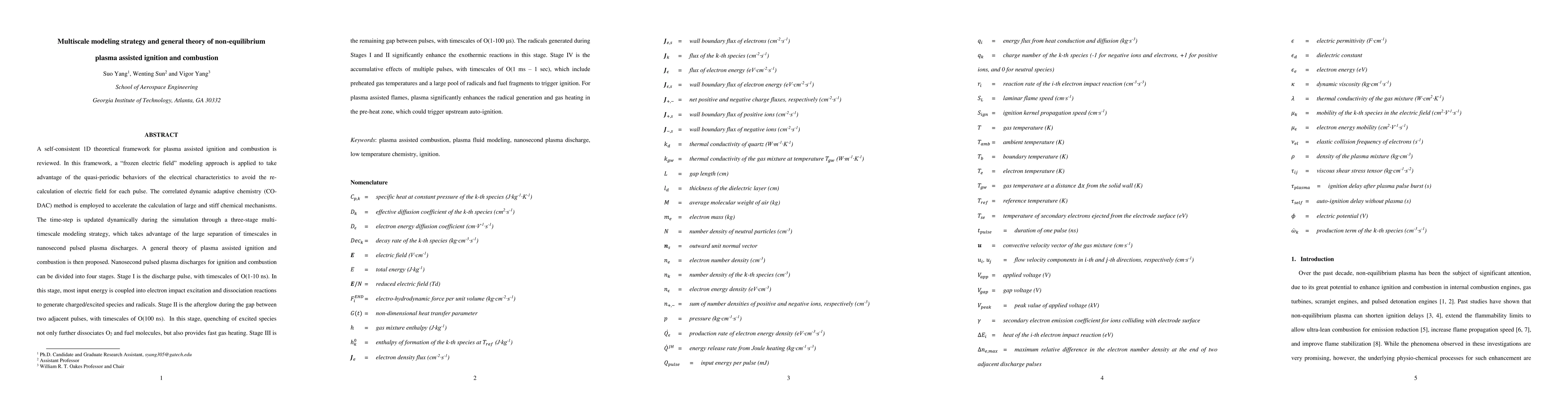 This paper proposes a selfconsistent 1D theoretical framework for plasma assisted ignition and combustion, utilizing a frozen electric field and CoDAC method for efficient computation. It outlines a four-stage theory of nanosecond pulsed plasma discharges, detailing the processes from discharge pulses to accumulative effects over multiple pulses.