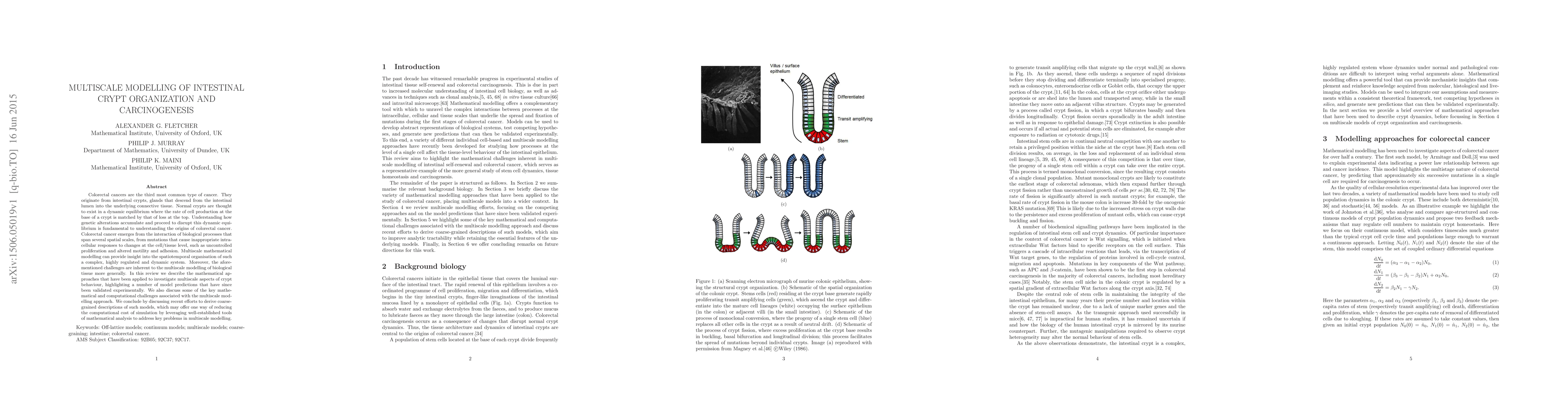 This paper reviews multiscale mathematical models used to understand the organization and carcinogenesis of intestinal crypts, emphasizing the interplay of genetic alterations and biological processes at various spatial scales. It highlights validated model predictions and discusses computational challenges, concluding with efforts to develop coarse-grained models to reduce simulation costs.