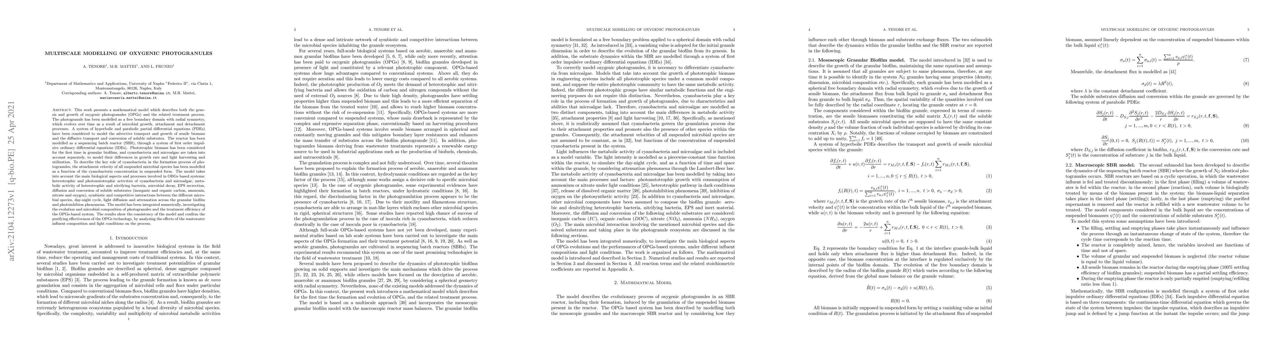 This work presents a mathematical model which describes both the genesis and growth of oxygenic photogranules (OPGs) and the related treatment process. The photogranule has been modelled as a free boundary domain with radial symmetry, which evolves over time as a result of microbial growth, attachment and detachment processes. A system of hyperbolic and parabolic PDEs has been considered to model the advective transport and growth of sessile biomass and the diffusive transport and conversion of soluble substrates. The reactor has been modelled as a sequencing batch reactor (SBR) through a system of first order IDEs. Phototrophic biomass has been considered for the first time in granular biofilms, and cyanobacteria and microalgae are taken into account separately to model their differences in growth rate and light harvesting and utilization. To describe the key role of cyanobacteria in the photogranules formation process, the attachment velocity of all suspended microbial species has been modelled as a function of the cyanobacteria concentration in suspended form. The model takes into account the main biological aspects and processes involved in OPGs based systems: heterotrophic and photoautotrophic activities of cyanobacteria and microalgae, metabolic activity of heterotrophic and nitrifying bacteria, microbial decay, EPS secrection, diffusion and conversion of soluble substrates (inorganic and organic carbon, ammonia, nitrate and oxygen), symbiotic and competitive interactions between the different microbial species, day-night cycle, light diffusion and attenuation across the granular biofilm and photoinhibion phenomena. The model has been integrated numerically, investigating the evolution and microbial composition of photogranules and the treatment efficiency of the OPGs-based system. The results show the consistency of the model and confirm the effectiveness of the OPGs technology.