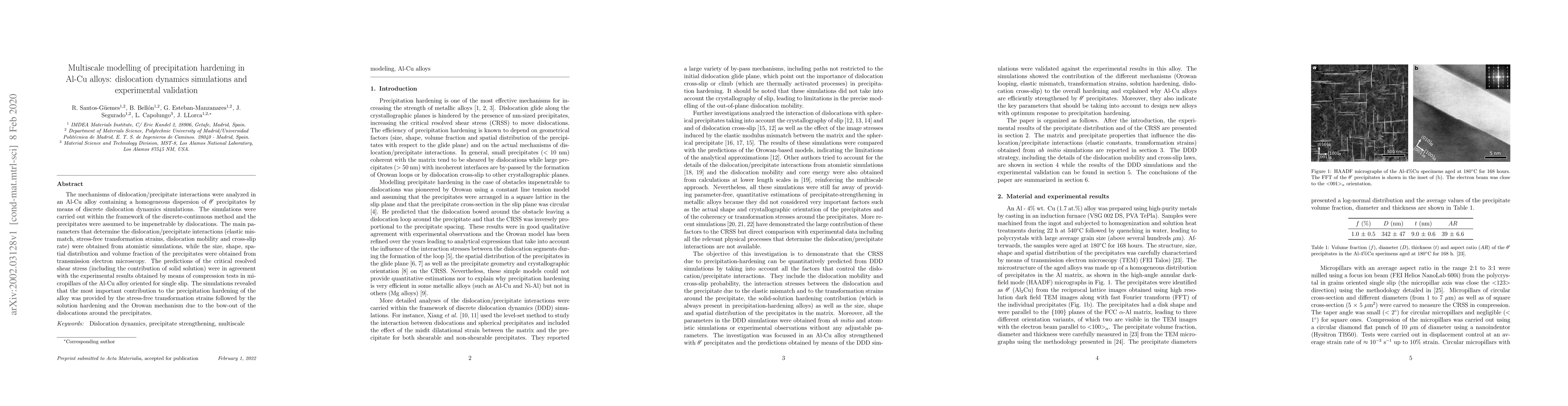 This study employs discrete dislocation dynamics simulations to analyze dislocation/precipitate interactions in Al-Cu alloys, validated by experimental compression tests. The simulations show that stress-free transformation strains significantly contribute to precipitation hardening, followed by solution hardening and Orowan looping.