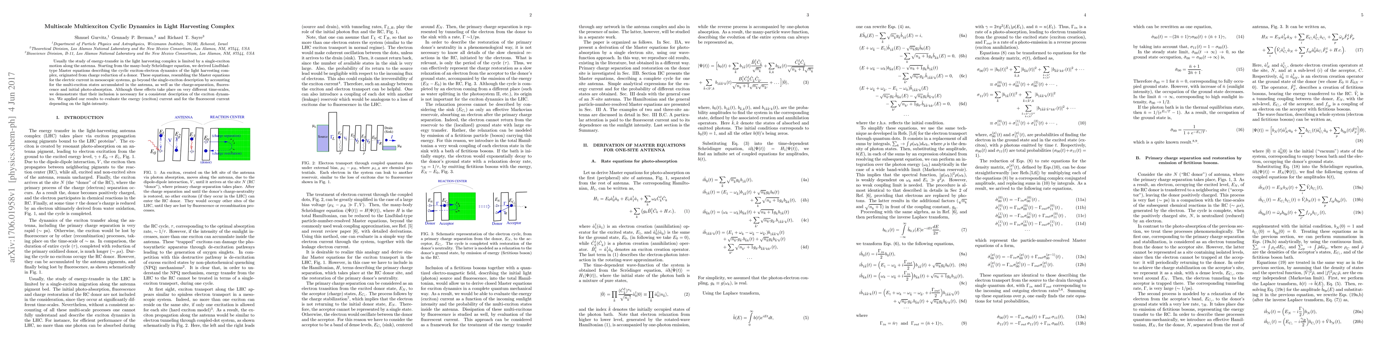 Usually the study of energy-transfer in the light harvesting complex is limited by a single-exciton motion along the antenna. Starting from the many-body Schr\"odinger equation, we derived Lindblad-type Master equations describing the cyclic exciton-electron dynamics of the light harvesting complex, originated from charge reduction of a donor. These equations, resembling the Master equations for the electric current in mesoscopic systems, go beyond the single-exciton description by accounting for the multi-exciton states accumulated in the antenna, as well as the charge-separation, fluorescence and initial photo-absorption. Although these effects take place on very different time-scales, we demonstrate that their inclusion is necessary for a consistent description of the exciton dynamics. We applied our results to evaluate the energy (exciton) current and for the fluorescent current depending on the light-intensity.