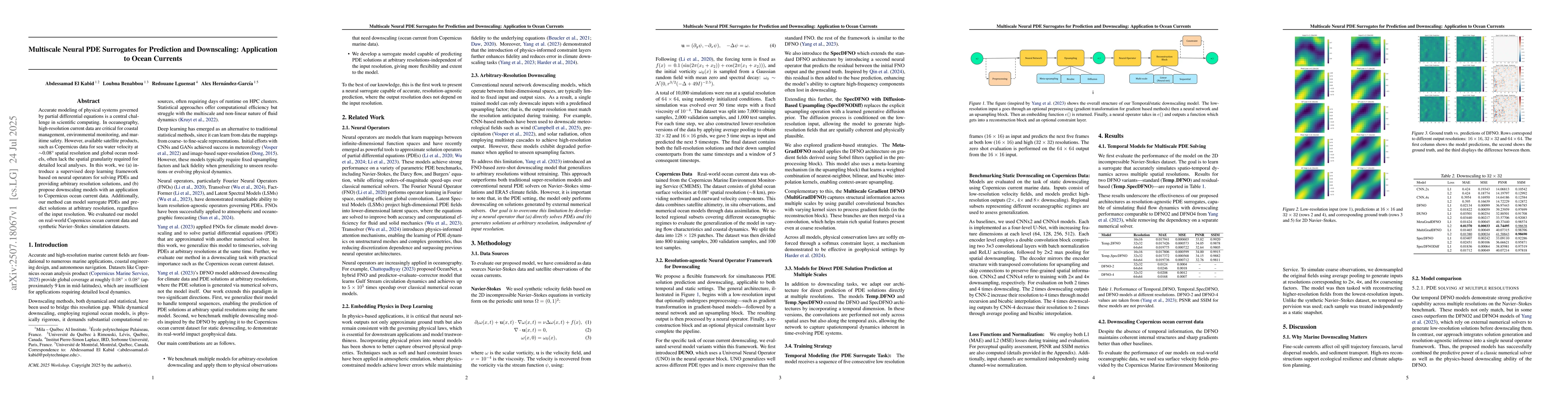 Accurate modeling of physical systems governed by partial differential equations is a central challenge in scientific computing. In oceanography, high-resolution current data are critical for coastal management, environmental monitoring, and maritime safety. However, available satellite products, such as Copernicus data for sea water velocity at ~0.08 degrees spatial resolution and global ocean models, often lack the spatial granularity required for detailed local analyses. In this work, we (a) introduce a supervised deep learning framework based on neural operators for solving PDEs and providing arbitrary resolution solutions, and (b) propose downscaling models with an application to Copernicus ocean current data. Additionally, our method can model surrogate PDEs and predict solutions at arbitrary resolution, regardless of the input resolution. We evaluated our model on real-world Copernicus ocean current data and synthetic Navier-Stokes simulation datasets.