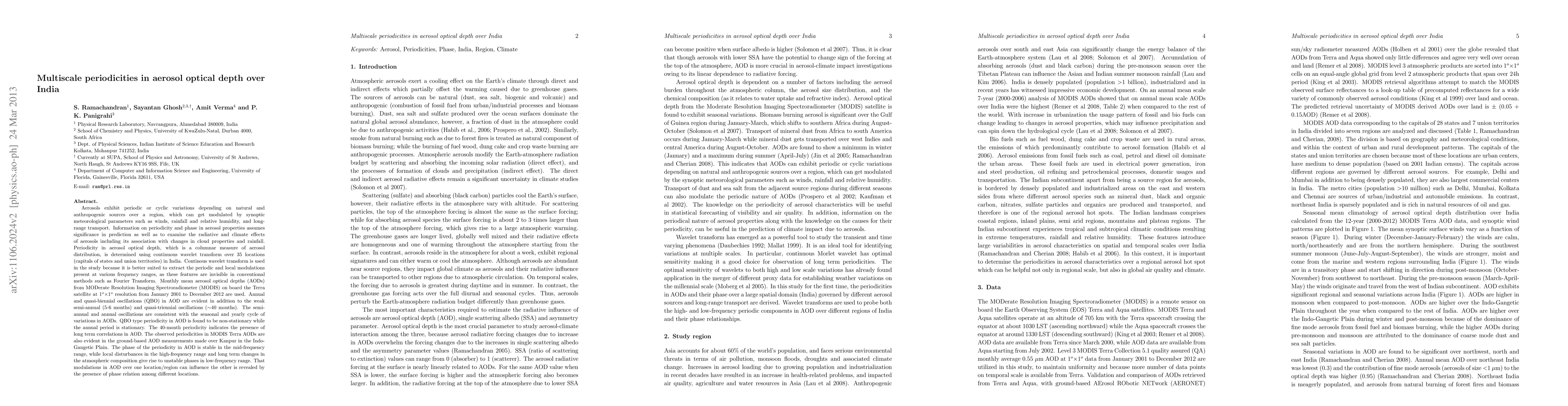 This study identifies multiscale periodicities in aerosol optical depth (AOD) over India using continuous wavelet transform on MODIS data from 2001 to 2012, revealing annual, quasi-biennial, semi-annual, and quasi-triennial oscillations. The findings suggest that these periodicities are influenced by seasonal cycles, meteorological parameters, and long-range transport, with implications for climate and radiative effects.