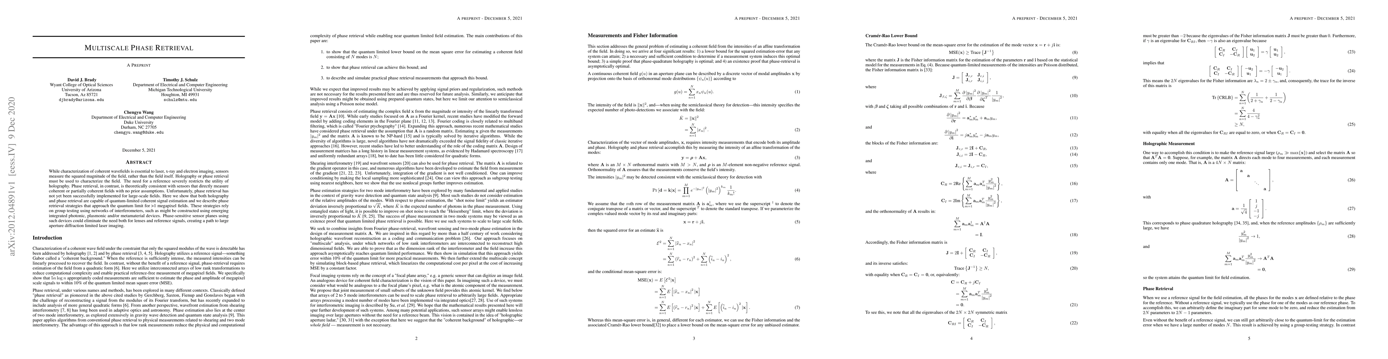 While characterization of coherent wavefields is essential to laser, x-ray and electron imaging, sensors measure the squared magnitude of the field, rather than the field itself. Holography or phase retrieval must be used to characterize the field. The need for a reference severely restricts the utility of holography. Phase retrieval, in contrast, is theoretically consistent with sensors that directly measure coherent or partially coherent fields with no prior assumptions. Unfortunately, phase retrieval has not yet been successfully implemented for large-scale fields. Here we show that both holography and phase retrieval are capable of quantum-limited coherent signal estimation and we describe phase retrieval strategies that approach the quantum limit for >1 megapixel fields. These strategies rely on group testing using networks of interferometers, such as might be constructed using emerging integrated photonic, plasmonic and/or metamaterial devices. Phase-sensitive sensor planes using such devices could eliminate the need both for lenses and reference signals, creating a path to large aperture diffraction limited laser imaging.