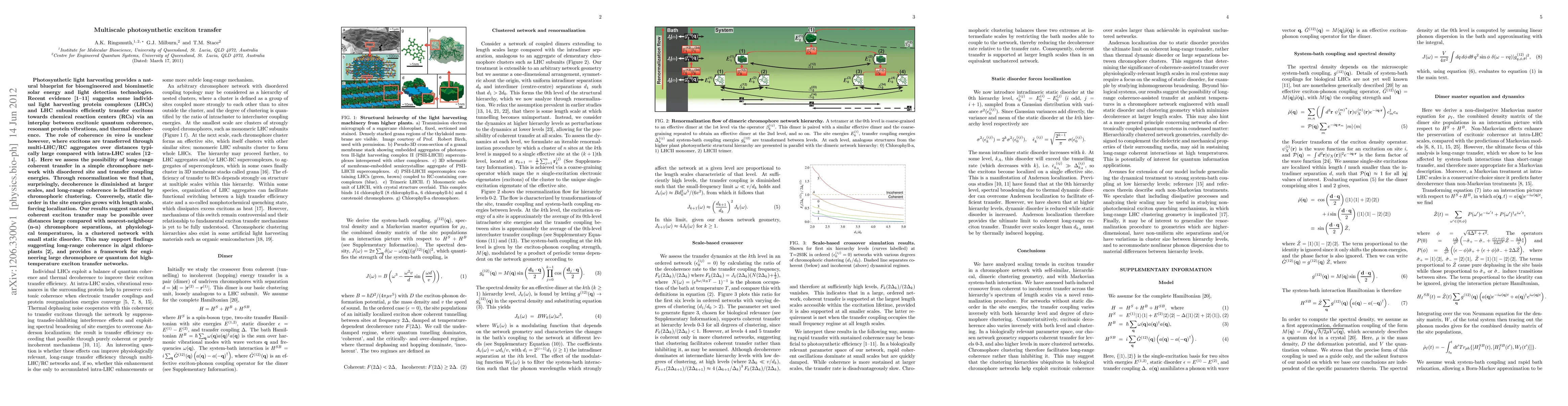 Photosynthetic light harvesting provides a natural blueprint for bioengineered and biomimetic solar energy and light detection technologies. Recent evidence suggests some individual light harvesting protein complexes (LHCs) and LHC subunits efficiently transfer excitons towards chemical reaction centers (RCs) via an interplay between excitonic quantum coherence, resonant protein vibrations, and thermal decoherence. The role of coherence in vivo is unclear however, where excitons are transferred through multi-LHC/RC aggregates over distances typically large compared with intra-LHC scales. Here we assess the possibility of long-range coherent transfer in a simple chromophore network with disordered site and transfer coupling energies. Through renormalization we find that, surprisingly, decoherence is diminished at larger scales, and long-range coherence is facilitated by chromophoric clustering. Conversely, static disorder in the site energies grows with length scale, forcing localization. Our results suggest sustained coherent exciton transfer may be possible over distances large compared with nearest-neighbour (n-n) chromophore separations, at physiological temperatures, in a clustered network with small static disorder. This may support findings suggesting long-range coherence in algal chloroplasts, and provides a framework for engineering large chromophore or quantum dot high-temperature exciton transfer networks.