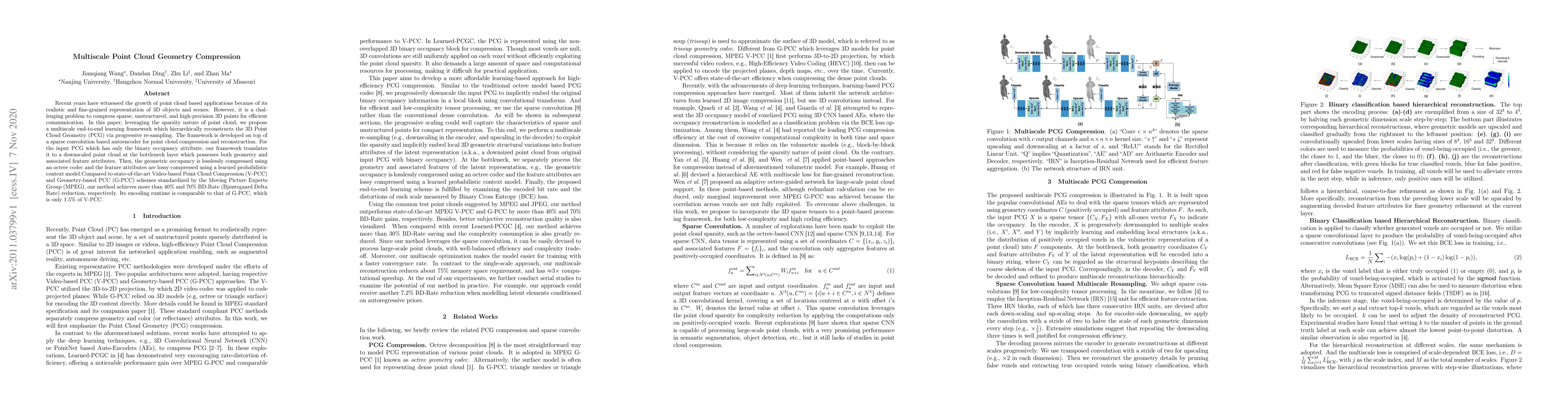 This paper proposes a multiscale learning framework for compressing 3D point cloud geometry using sparse convolution and progressive re-sampling. It achieves significant BD-Rate reductions compared to existing methods, while maintaining comparable encoding runtime.