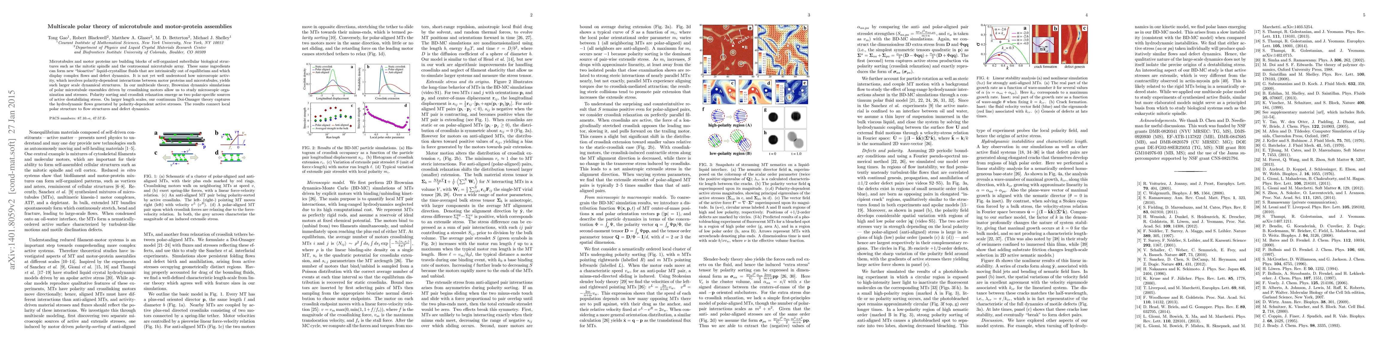 This paper develops a multiscale theory to understand how microscopic interactions between motor proteins and microtubules generate complex, large-scale flows and defect dynamics in biological structures. The study combines Brownian dynamics simulations with continuum Doi-Onsager theory to link local polar organization to macroscopic active stresses and flow patterns.