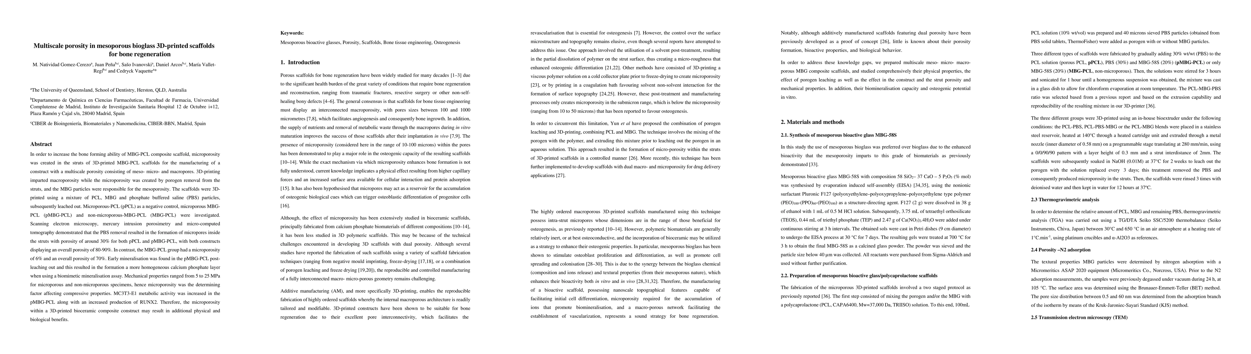 This study investigates the impact of microporosity on the mechanical and biological properties of 3D-printed mesoporous bioglass-PCL composite scaffolds for bone regeneration. The introduction of microporosity via porogen removal enhanced mineralization, mechanical strength, and osteoblastic activity, suggesting it provides significant physical and biological benefits.