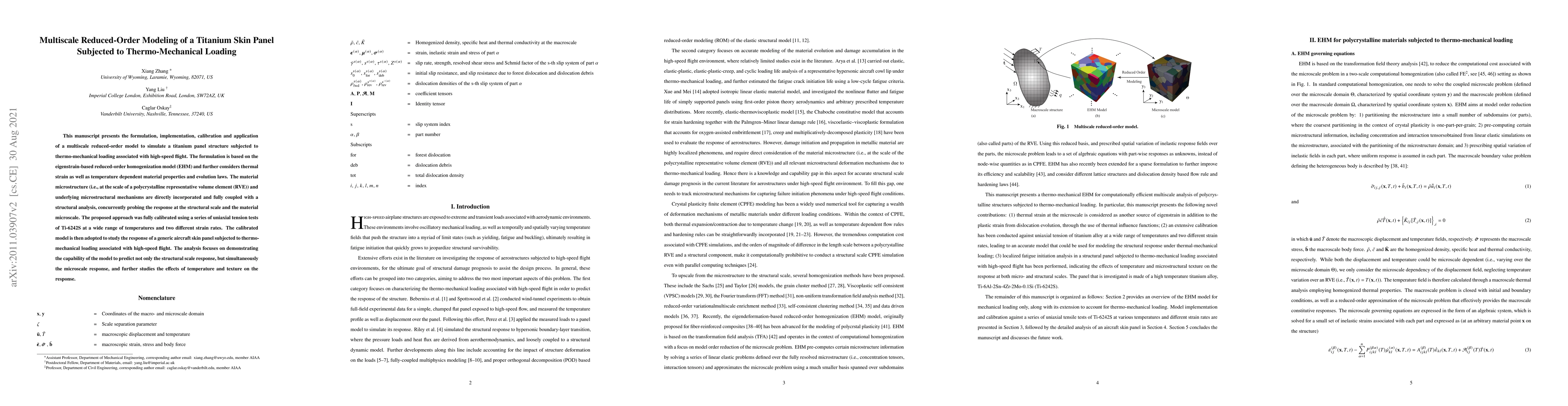 This manuscript presents the formulation, implementation, calibration and application of a multiscale reduced-order model to simulate a titanium panel structure subjected to thermo-mechanical loading associated with high-speed flight. The formulation is based on the eigenstrain-based reduced-order homogenization model (EHM) and further considers thermal strain as well as temperature dependent material properties and evolution laws. The material microstructure (i.e., at the scale of a polycrystalline representative volume element (RVE)) and underlying microstructural mechanisms are directly incorporated and fully coupled with a structural analysis, allowing concurrently probing the response at the structural scale and the material microscale. The proposed approach was fully calibrated using a series of uniaxial tension tests of Ti-6242S at a wide range of temperatures and two different strain rates. The calibrated model is then adopted to study the response of a generic aircraft skin panel subjected to thermo-mechanical loading associated with high-speed flight. The analysis focuses on demonstrating the capability of the model to predict not only the structural scale response, but simultaneously the microscale response, and further studies the effects of temperature and texture on the response.