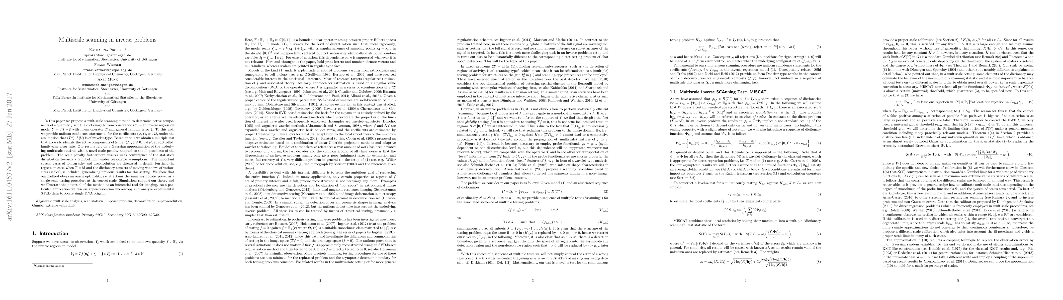This research introduces a multiscale scanning method to identify active components in inverse problems, providing uniform confidence statements for coefficients under wavelet-type assumptions. It offers a multiple test for active component identification at controlled error rates, supported by a Gaussian approximation and scale penalty for ill-posed problems, ensuring weak convergence to a Gumbel limit. The method is demonstrated to be oracle optimal and is applicable to various cases including tomography, deconvolution, and regression with moving windows, with simulations and a super-resolution microscopy application shown for validation.