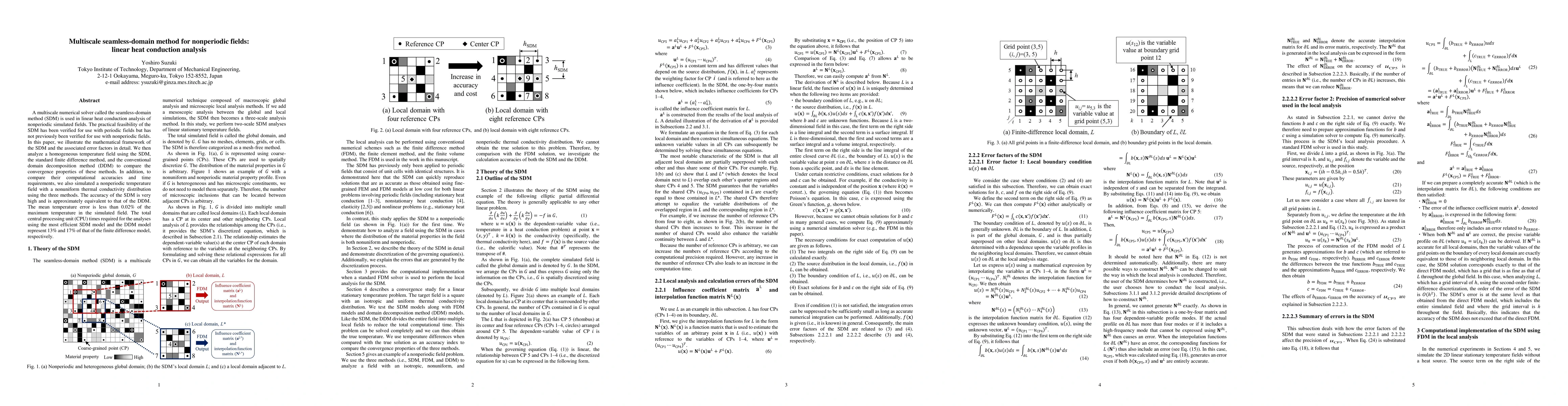 A multiscale numerical solver called the seamless-domain method (SDM) is used in linear heat conduction analysis of nonperiodic simulated fields. The practical feasibility of the SDM has been verified for use with periodic fields but has not previously been verified for use with nonperiodic fields. In this paper, we illustrate the mathematical framework of the SDM and the associated error factors in detail. We then analyze a homogeneous temperature field using the SDM, the standard finite difference method, and the conventional domain decomposition method (DDM) to compare the convergence properties of these methods. In addition, to compare their computational accuracies and time requirements, we also simulated a nonperiodic temperature field with a nonuniform thermal conductivity distribution using the three methods. The accuracy of the SDM is very high and is approximately equivalent to that of the DDM. The mean temperature error is less than 0.02% of the maximum temperature in the simulated field. The total central processing unit (CPU) times required for the analyses using the most efficient SDM model and the DDM model represent 13% and 17% of that of the finite difference model, respectively.