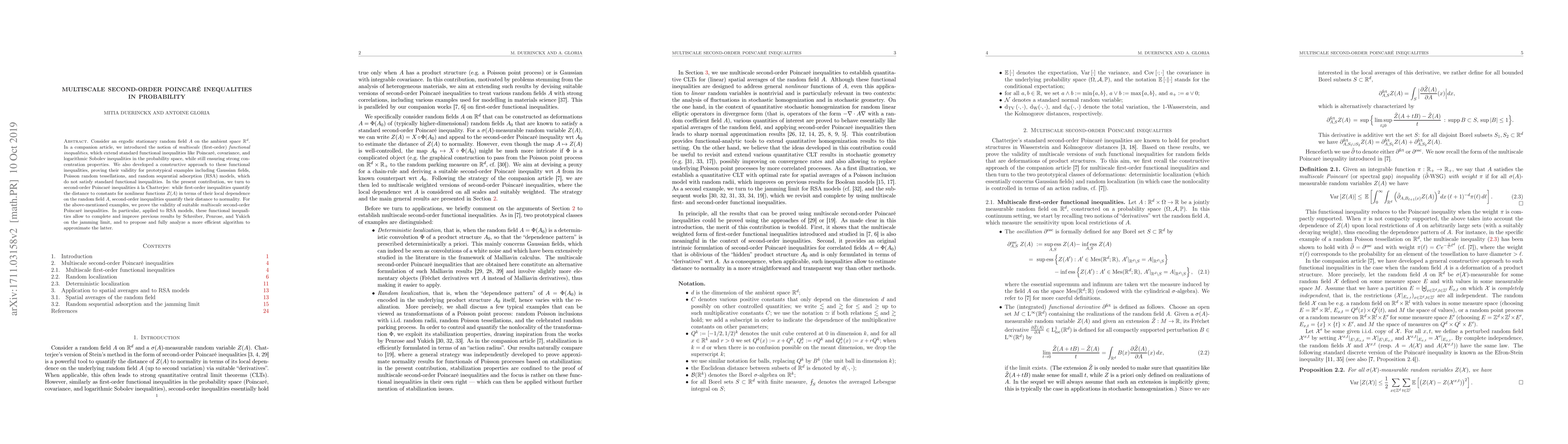This paper extends the notion of first-order multiscale functional inequalities to second-order Poincar\'e inequalities for ergodic stationary random fields, proving their applicability to Gaussian fields, Poisson random tessellations, and random sequential adsorption models, thereby improving previous results and proposing a more efficient algorithm for the jamming limit.