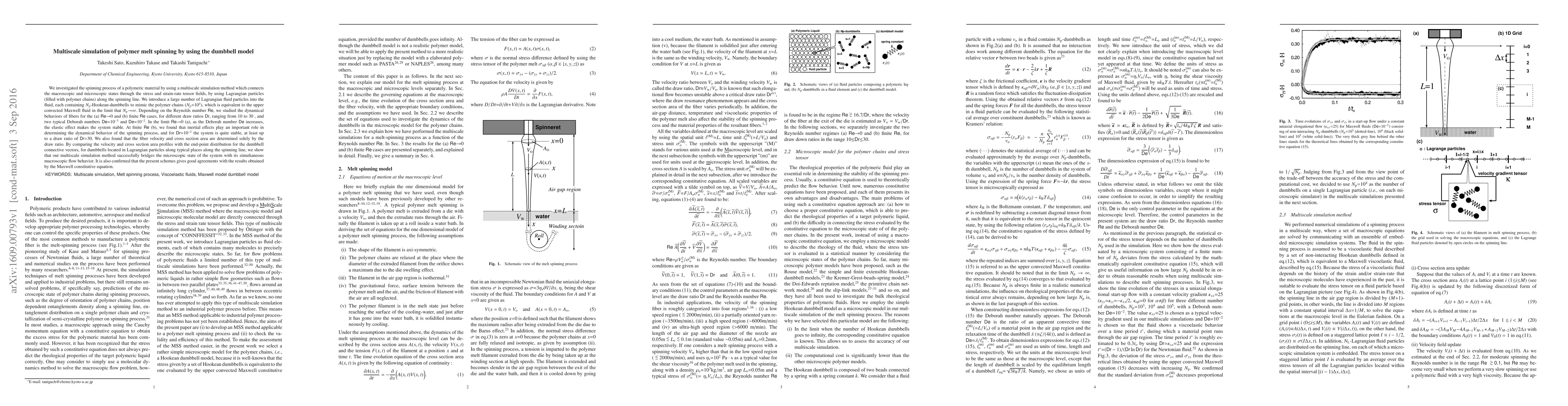 We investigated the spinning process of a polymeric material by using a multiscale simulation method which connects the macroscopic and microscopic states through the stress and strain-rate tensor fields, by using Lagrangian particles (filled with polymer chains) along the spinning line. We introduce a large number of Lagrangian fluid particles into the fluid, each containing Np-Hookean-dumbbells to mimic the polymer chains (Np=$10^4$), which is equivalent to the upper convected Maxwell fluid in the limit that Np$\rightarrow \infty$. Depending on the Reynolds number Re, we studied the dynamical behaviors of fibers for the (a) Re =0 and (b) finite Re cases, for different draw ratios Dr, ranging from 10 to 30, and two typical Deborah numbers De=$10^{-3}$ and De=$10^{-2}$. In the limit Re$\rightarrow$ 0 (a), as the Deborah number De increases, the elastic effect makes the system stable. At finite Re (b), we found that inertial effects play an important role in determining the dynamical behavior of the spinning process, and for Dr=$10^{-2}$ the system is quite stable, at least up to a draw ratio of Dr=30. We also found that the fiber velocity and cross section area are determined solely by the draw ratio. By comparing the velocity and cross section area profiles with the end-point distribution for the dumbbell connective vectors, for dumbbells located in Lagrangian particles along typical places along the spinning line, we show that our multiscale simulation method successfully bridges the microscopic state of the system with its simultaneous macroscopic flow behavior. It is also confirmed that the present schemes gives good agreements with the results obtained by the Maxwell constitutive equation.