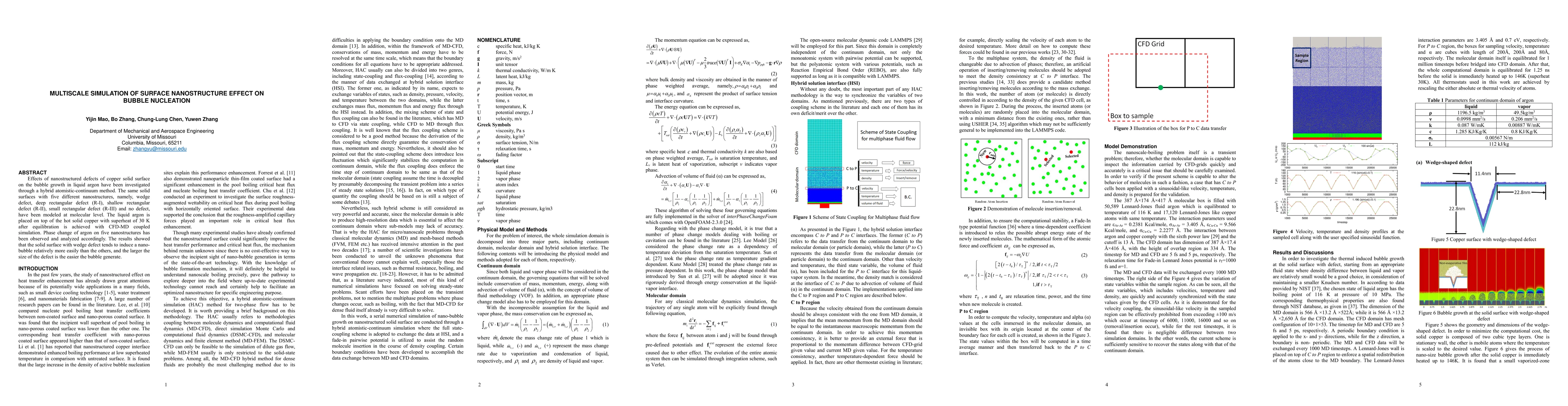Effects of nanostructured defects of copper solid surface on the bubble growth in liquid argon have been investigated through a hybrid atomistic-continuum method. The same solid surfaces with five different nanostructures, namely, wedge defect, deep rectangular defect (R-I), shallow rectangular defect (R-II), small rectangular defect (R-III) and no defect, have been modeled at molecular level. The liquid argon is placed on top of the hot solid copper with superheat of 30 K after equilibration is achieved with CFD-MD coupled simulation. Phase change of argon on five nanostructures has been observed and analyzed accordingly. The results showed that the solid surface with wedge defect tends to induce a nano-bubble relatively more easily than the others, and the larger the size of the defect is the easier the bubble generate.