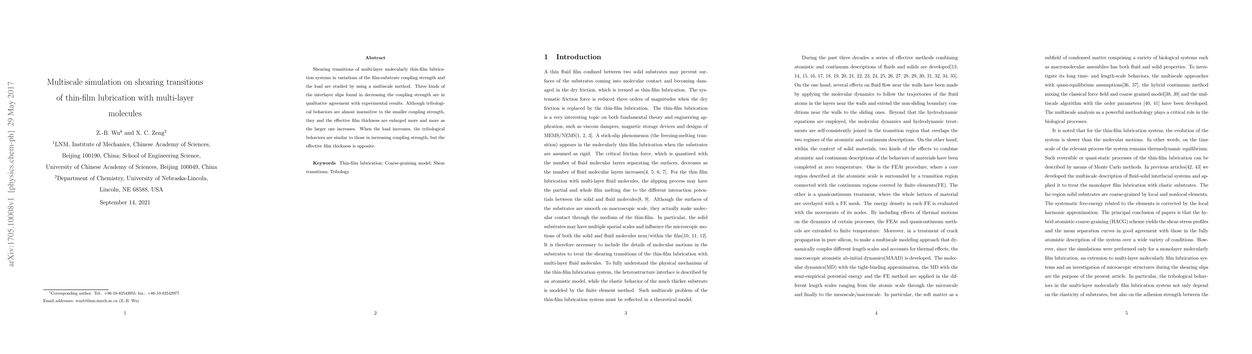 This multiscale simulation investigates shearing transitions in thin-film lubrication with multi-layer molecules, revealing three types of interlayer slips that align with experimental findings. As film-substrate coupling strength and load increase, tribological behaviors and effective film thickness respond differently, with the former generally increasing and the latter decreasing under load.