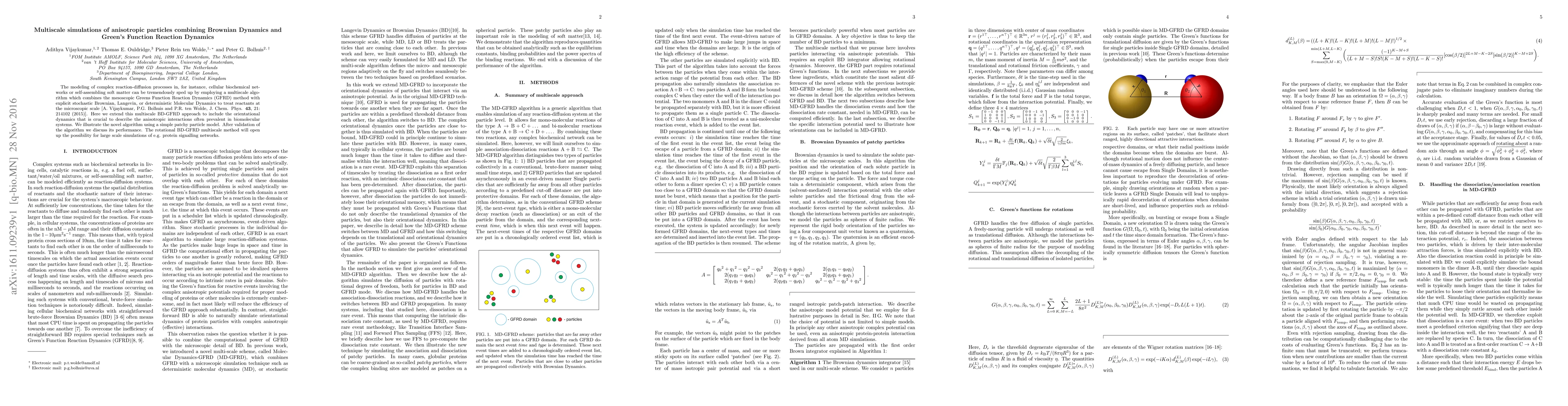 This paper presents a multiscale simulation method combining Brownian Dynamics and Green's Function Reaction Dynamics to model anisotropic particle interactions in complex biochemical networks. The extended algorithm, validated with a patchy particle model, promises enhanced simulations of large-scale biomolecular systems like protein signaling networks.