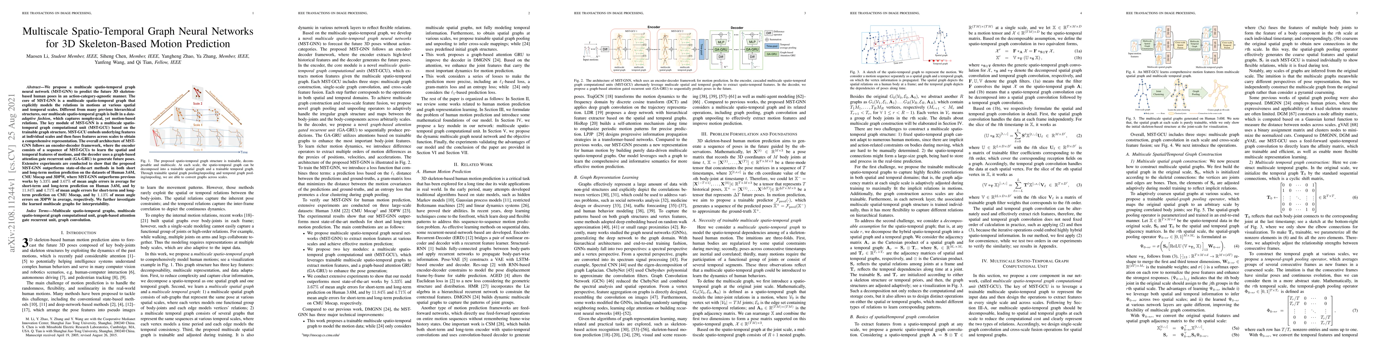 The paper proposes a multiscale spatio-temporal graph neural network (MST-GNN) for predicting future 3D skeleton-based human poses, outperforming previous methods by significant margins on multiple datasets. MST-GNN uses a data-adaptive multiscale graph to capture motion-based relations and a trainable graph computational unit to fuse features across scales.
