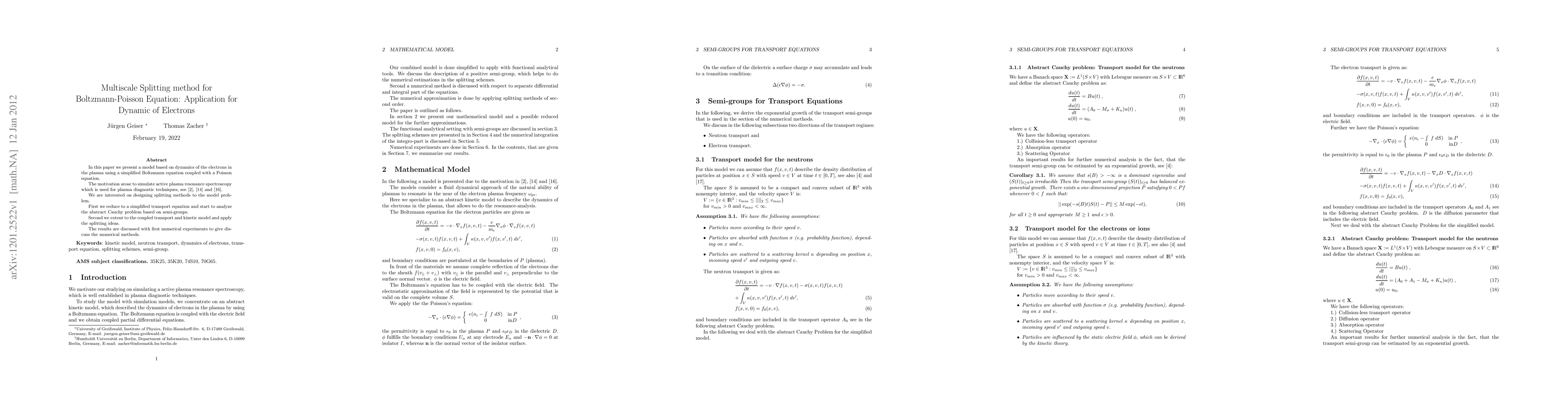 In this paper we present a model based on dynamics of the electrons in the plasma using a simplified Boltzmann equation coupled with a Poisson equation. The motivation arose to simulate active plasma resonance spectroscopy which is used for plasma diagnostic techniques, see [Braith2009]. We are interested on designing splitting methods to the model problem. First we reduce to a simplified transport equation and start to analyze the abstract Cauchy problem based on semi-groups. Second we extent to the coupled transport and kinetic model and apply the splitting ideas. The results are discussed with first numerical experiments to give discuss the numerical methods.