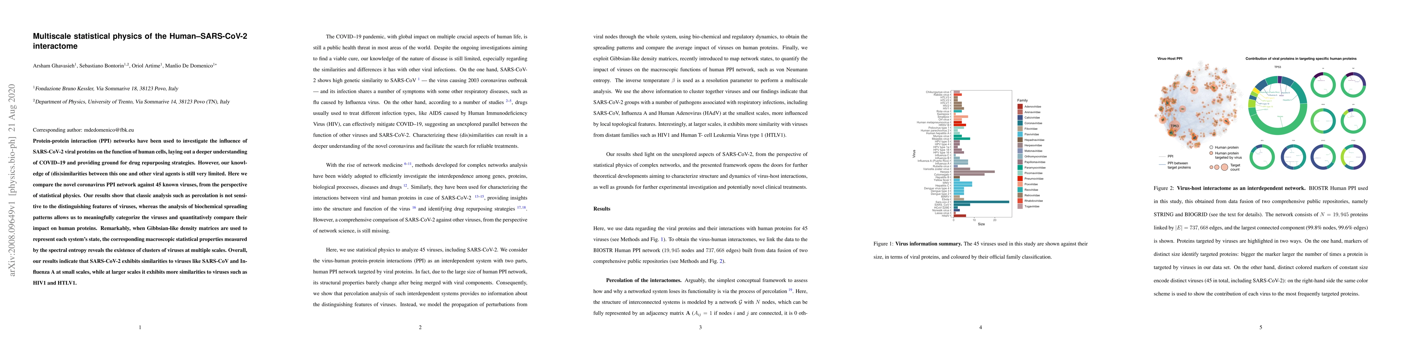 Protein-protein interaction (PPI) networks have been used to investigate the influence of SARS-CoV-2 viral proteins on the function of human cells, laying out a deeper understanding of COVID--19 and providing ground for drug repurposing strategies. However, our knowledge of (dis)similarities between this one and other viral agents is still very limited. Here we compare the novel coronavirus PPI network against 45 known viruses, from the perspective of statistical physics. Our results show that classic analysis such as percolation is not sensitive to the distinguishing features of viruses, whereas the analysis of biochemical spreading patterns allows us to meaningfully categorize the viruses and quantitatively compare their impact on human proteins. Remarkably, when Gibbsian-like density matrices are used to represent each system's state, the corresponding macroscopic statistical properties measured by the spectral entropy reveals the existence of clusters of viruses at multiple scales. Overall, our results indicate that SARS-CoV-2 exhibits similarities to viruses like SARS-CoV and Influenza A at small scales, while at larger scales it exhibits more similarities to viruses such as HIV1 and HTLV1.