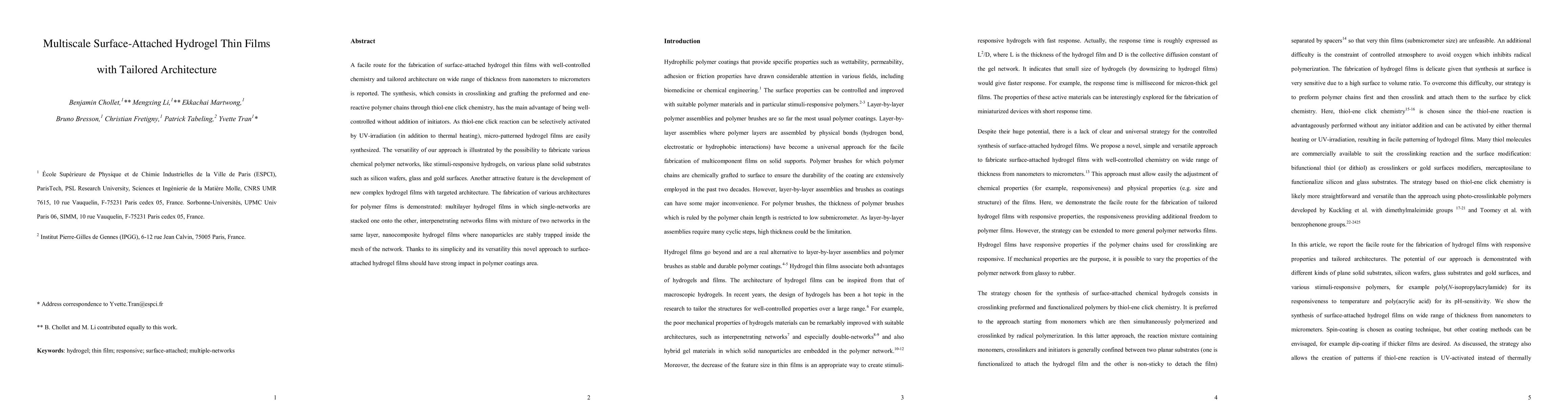 This paper presents a method for creating surface-attached hydrogel thin films with precise control over chemistry and architecture, ranging from nanometers to micrometers, using thiol-ene click chemistry. The approach allows for the fabrication of various complex hydrogel structures, including multilayer, interpenetrating, and nanocomposite films, without the need for initiators.