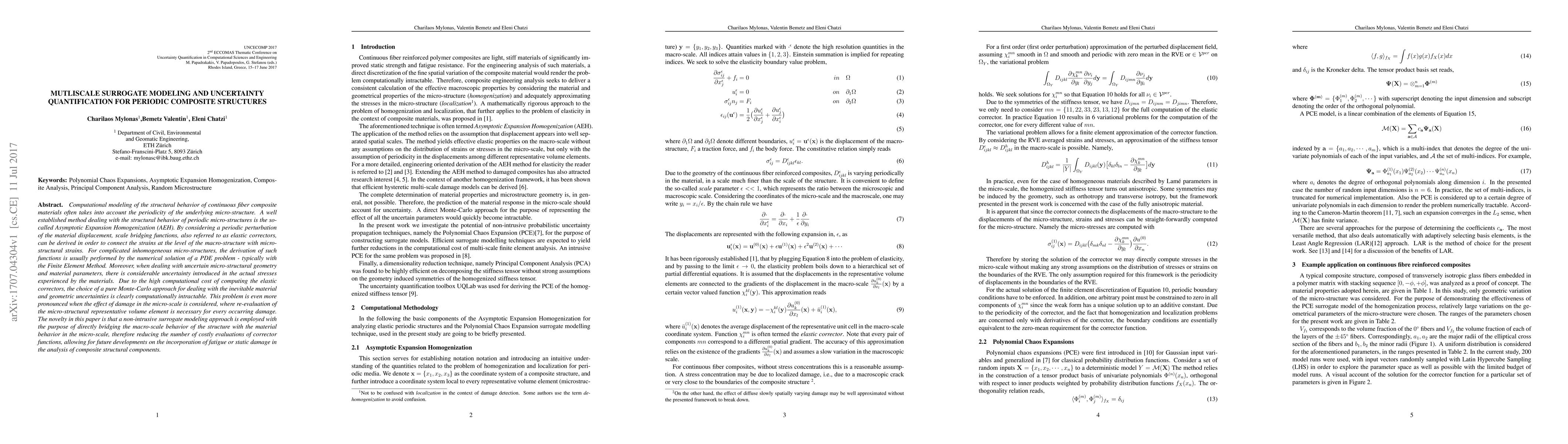 Computational modeling of the structural behavior of continuous fiber composite materials often takes into account the periodicity of the underlying micro-structure. A well established method dealing with the structural behavior of periodic micro-structures is the so- called Asymptotic Expansion Homogenization (AEH). By considering a periodic perturbation of the material displacement, scale bridging functions, also referred to as elastic correctors, can be derived in order to connect the strains at the level of the macro-structure with micro- structural strains. For complicated inhomogeneous micro-structures, the derivation of such functions is usually performed by the numerical solution of a PDE problem - typically with the Finite Element Method. Moreover, when dealing with uncertain micro-structural geometry and material parameters, there is considerable uncertainty introduced in the actual stresses experienced by the materials. Due to the high computational cost of computing the elastic correctors, the choice of a pure Monte-Carlo approach for dealing with the inevitable material and geometric uncertainties is clearly computationally intractable. This problem is even more pronounced when the effect of damage in the micro-scale is considered, where re-evaluation of the micro-structural representative volume element is necessary for every occurring damage. The novelty in this paper is that a non-intrusive surrogate modeling approach is employed with the purpose of directly bridging the macro-scale behavior of the structure with the material behavior in the micro-scale, therefore reducing the number of costly evaluations of corrector functions, allowing for future developments on the incorporation of fatigue or static damage in the analysis of composite structural components.