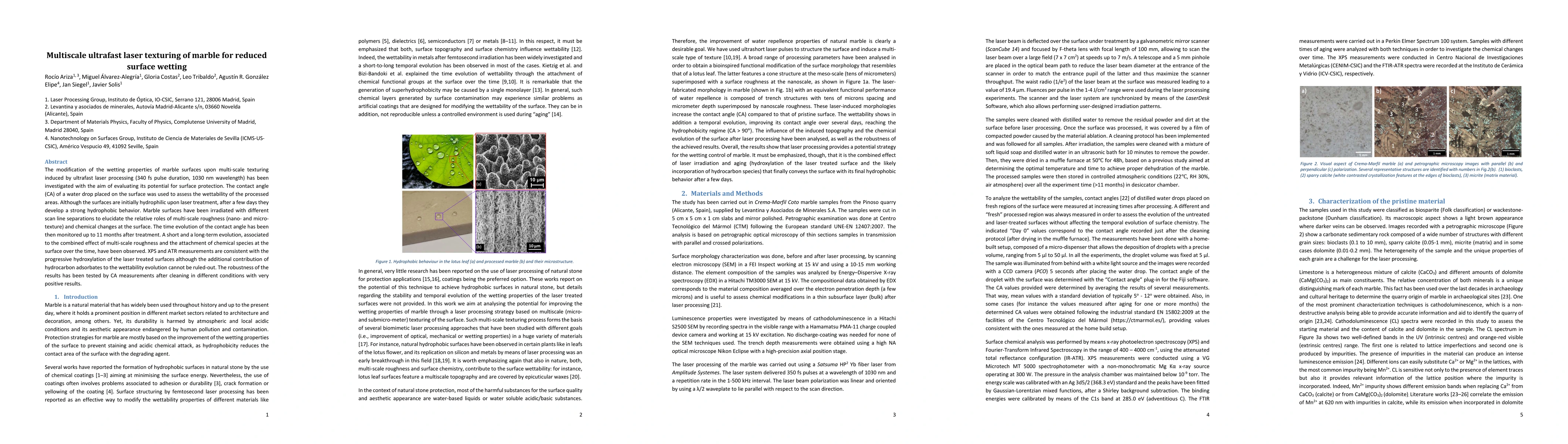 The modification of the wetting properties of marble surfaces upon multi-scale texturing induced by ultrafast laser processing (340 fs pulse duration, 1030 nm wavelength) has been investigated with the aim of evaluating its potential for surface protection. The contact angle (CA) of a water drop placed on the surface was used to assess the wettability of the processed areas. Although the surfaces are initially hydrophilic upon laser treatment, after a few days they develop a strong hydrophobic behavior. Marble surfaces have been irradiated with different scan line separations to elucidate the relative roles of multi-scale roughness (nano- and micro-texture) and chemical changes at the surface. The time evolution of the contact angle has been then monitored up to 11 months after treatment. A short and a long-term evolution, associated to the combined effect of multi-scale roughness and the attachment of chemical species at the surface over the time, have been observed. XPS and ATR measurements are consistent with the progressive hydroxylation of the laser treated surfaces although the additional contribution of hydrocarbon adsorbates to the wettability evolution cannot be ruled-out. The robustness of the results has been tested by CA measurements after cleaning in different conditions with very positive results.