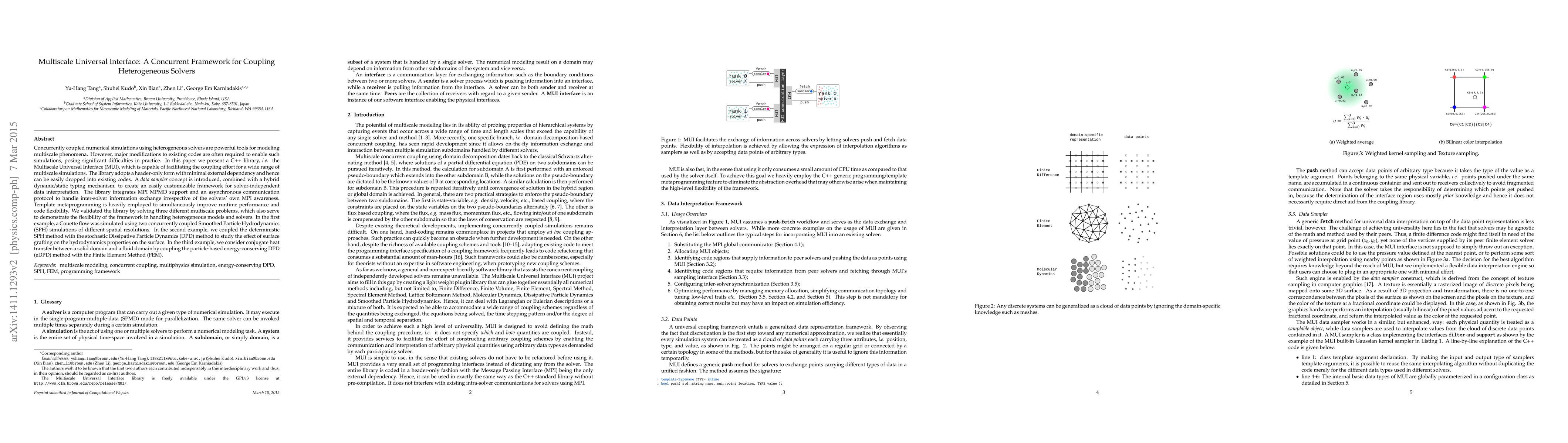 The paper introduces the Multiscale Universal Interface (MUI), a C++ library designed to facilitate the coupling of heterogeneous solvers for multiscale simulations. The library features a header-only design with minimal dependencies, employing template metaprogramming and hybrid typing for flexibility and performance, validated through three multiscale problem examples.