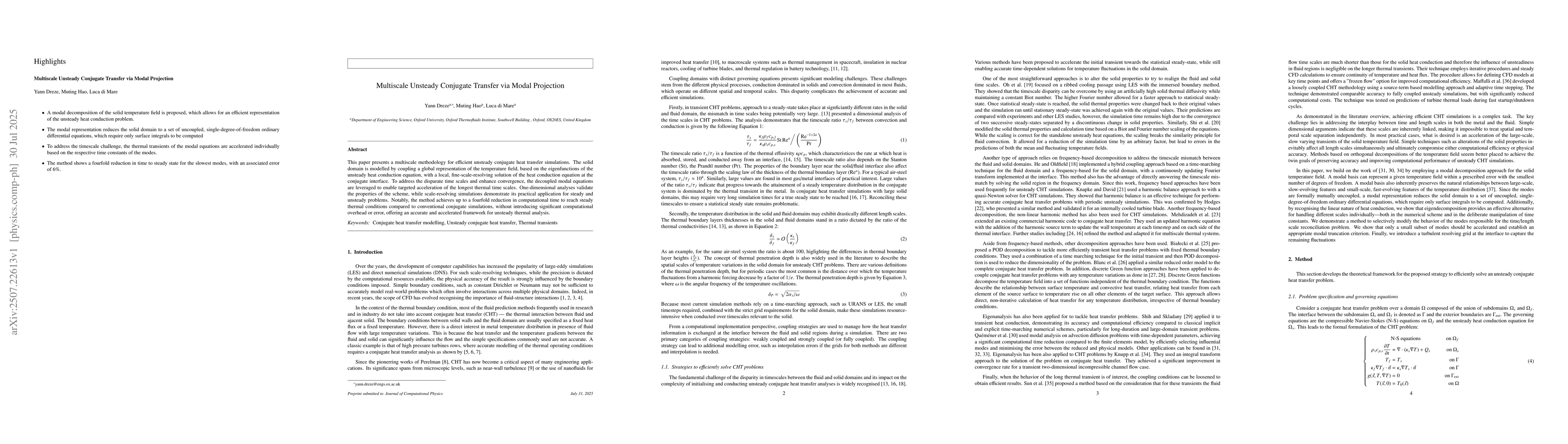 This paper presents a multiscale methodology for efficient unsteady conjugate heat transfer simulations. The solid domain is modelled by coupling a global representation of the temperature field, based on the eigenfunctions of the unsteady heat conduction equation, with a local, fine-scale-resolving solution of the heat conduction equation at the conjugate interface. To address the disparate time scales and enhance convergence, the decoupled modal equations are leveraged to enable targeted acceleration of the longest thermal time scales. One-dimensional analyses validate the properties of the scheme, while scale-resolving simulations demonstrate its practical application for steady and unsteady problems. Notably, the method achieves up to a fourfold reduction in computational time to reach steady thermal conditions compared to conventional conjugate simulations, without introducing significant computational overhead or error, offering an accurate and accelerated framework for unsteady thermal analysis.