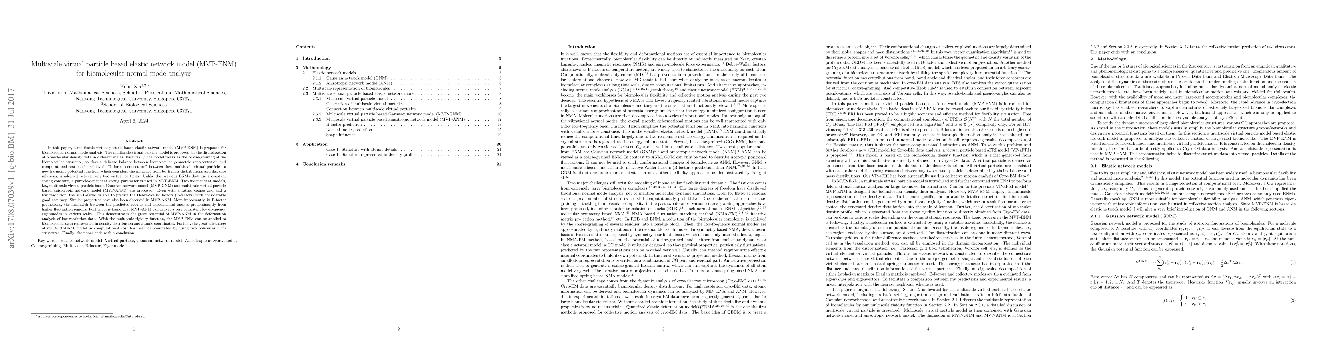 This paper introduces a multiscale virtual particle based elastic network model (MVP-ENM) for biomolecular normal mode analysis, achieving a balance between geometric representation and computational efficiency. The model uses a particle-dependent spring parameter and predicts Debye-Waller factors accurately, especially with low-resolution data, demonstrating its potential for deformation analysis.