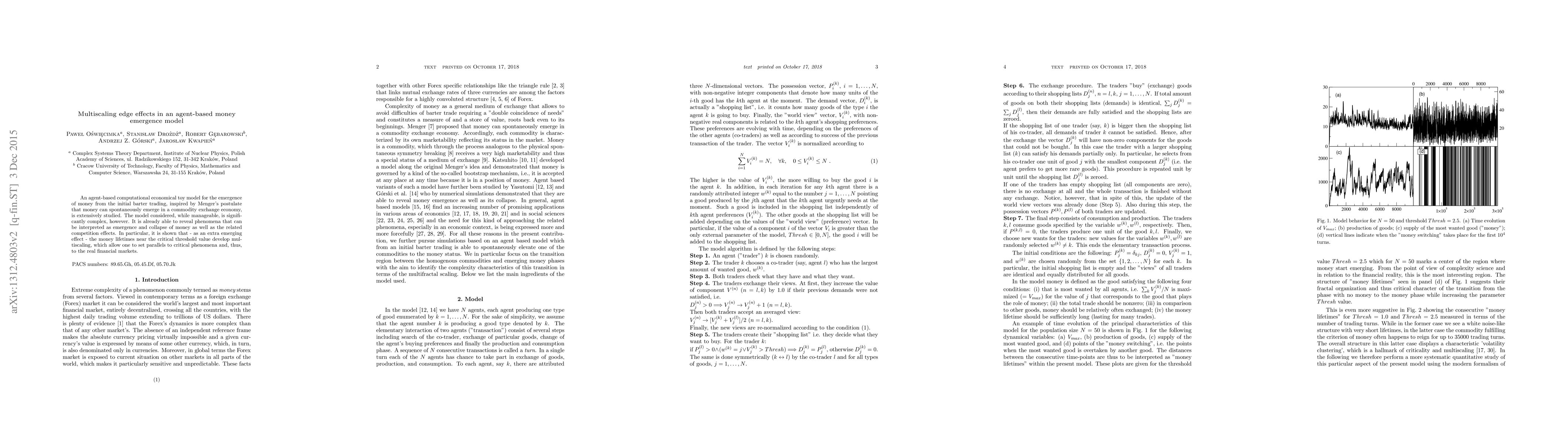 This paper explores an agent-based model for the spontaneous emergence of money from barter, revealing phenomena like money's emergence and collapse, and competition effects. It finds that near the critical threshold, money lifetimes exhibit multiscaling, drawing parallels to critical phenomena in real financial markets.