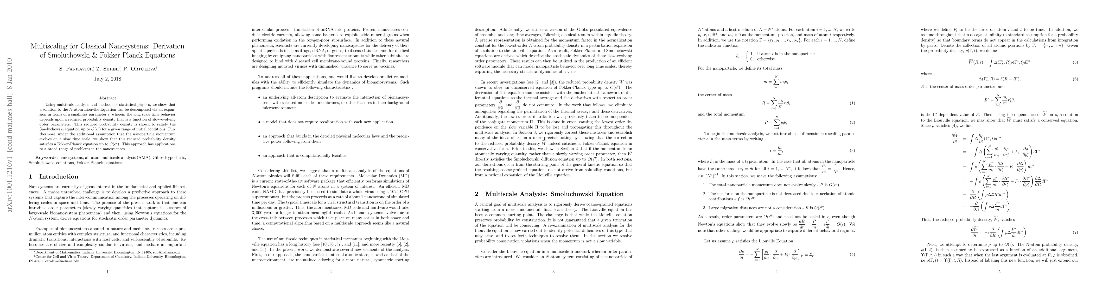 Using multiscale analysis and methods of statistical physics, we show that a solution to the N-atom Liouville Equation can be decomposed via an expansion in terms of a smallness parameter epsilon, wherein the long scale time behavior depends upon a reduced probability density that is a function of slow-evolving order parameters. This reduced probability density is shown to satisfy the Smoluchowski equation up to order epsilon squared for a given range of initial conditions. Furthermore, under the additional assumption that the nanoparticle momentum evolves on a slow time scale, we show that this reduced probability density satisfies a Fokker-Planck equation up to the same order in epsilon. This approach applies to a broad range of problems in the nanosciences.