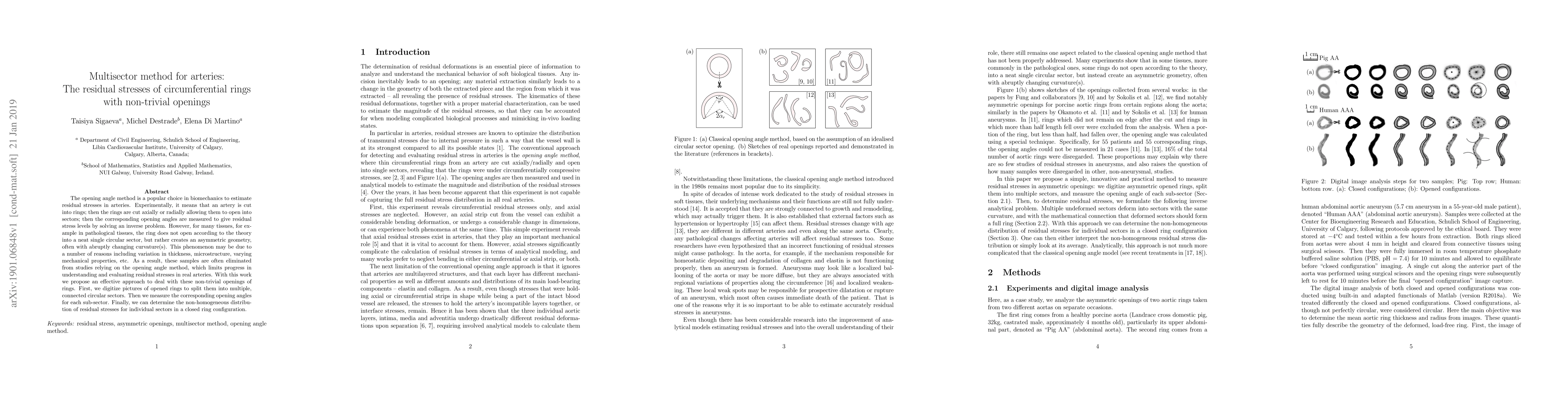 The paper proposes a multisector method to analyze residual stresses in arteries that do not open into neat single circular sectors due to asymmetry caused by variations in thickness, microstructure, and mechanical properties. This method involves digitalizing pictures of opened rings to split them into multiple connected circular sectors, measuring opening angles for each sub-sector, and determining non-homogeneous distribution of residual stresses for individual sectors.