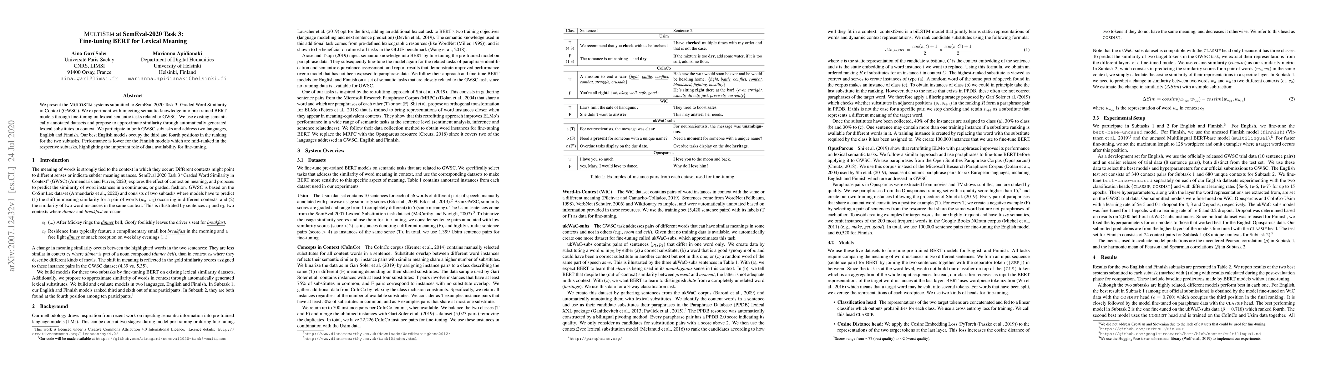 This research fine-tunes BERT models for lexical semantic tasks in SemEval 2020's Graded Word Similarity in Context (GWSC), achieving notable results for English but comparatively lower for Finnish, underscoring the impact of data availability. The study uses semantically annotated datasets and contextual lexical substitutes to approximate word similarity.