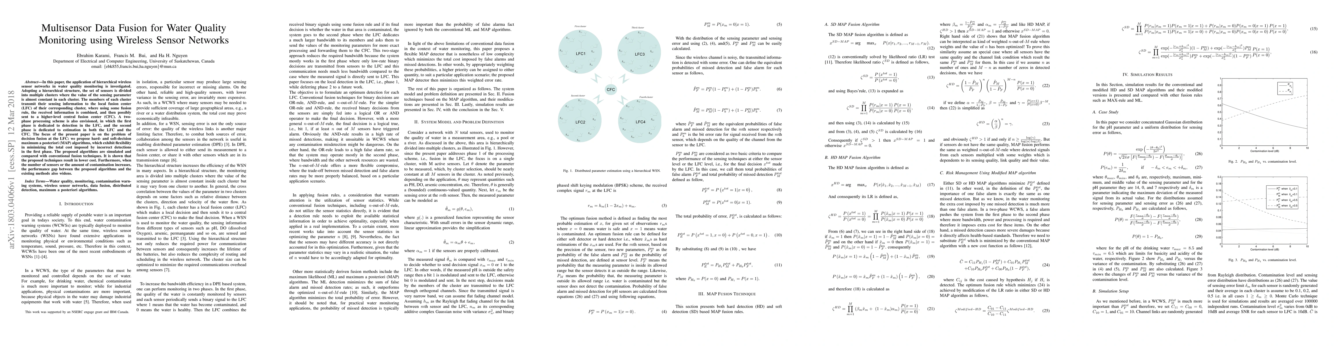 This paper proposes a hierarchical wireless sensor network system for water quality monitoring, using decision fusion algorithms to minimize costs and improve performance, particularly in high-sensor or contaminated environments.