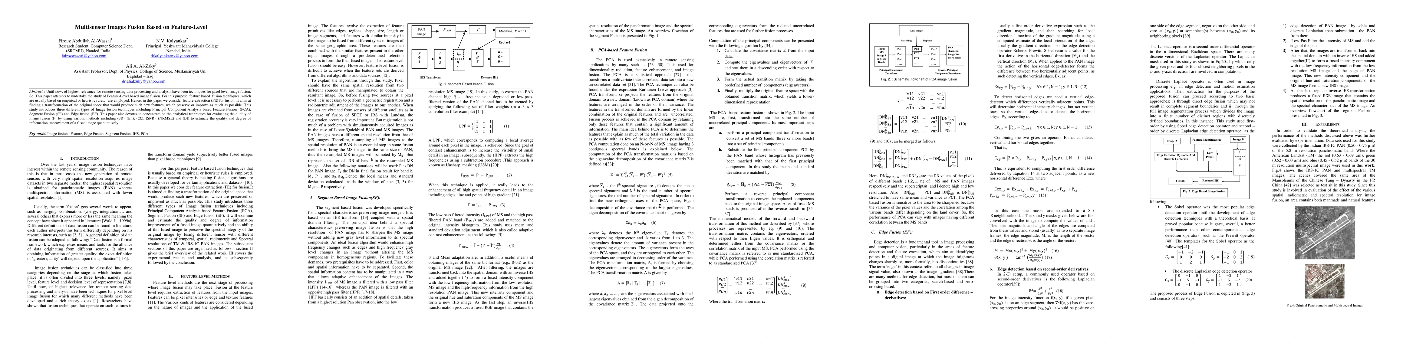 Until now, of highest relevance for remote sensing data processing and analysis have been techniques for pixel level image fusion. So, This paper attempts to undertake the study of Feature-Level based image fusion. For this purpose, feature based fusion techniques, which are usually based on empirical or heuristic rules, are employed. Hence, in this paper we consider feature extraction (FE) for fusion. It aims at finding a transformation of the original space that would produce such new features, which preserve or improve as much as possible. This study introduces three different types of Image fusion techniques including Principal Component Analysis based Feature Fusion (PCA), Segment Fusion (SF) and Edge fusion (EF). This paper also devotes to concentrate on the analytical techniques for evaluating the quality of image fusion (F) by using various methods including (SD), (En), (CC), (SNR), (NRMSE) and (DI) to estimate the quality and degree of information improvement of a fused image quantitatively.