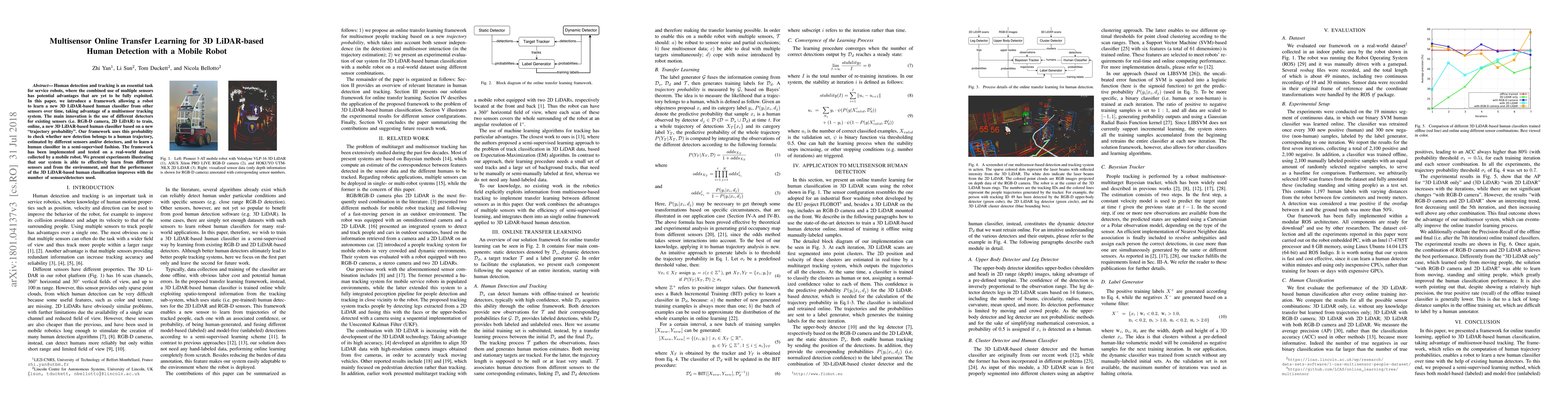 This paper presents a framework for a mobile robot to enhance 3D LiDAR-based human detection through online transfer learning from multiple sensors, including RGB-D cameras and 2D LiDAR. The system leverages trajectory probability to semi-supervised learn a new human classifier, demonstrating improved performance with more sensor inputs.