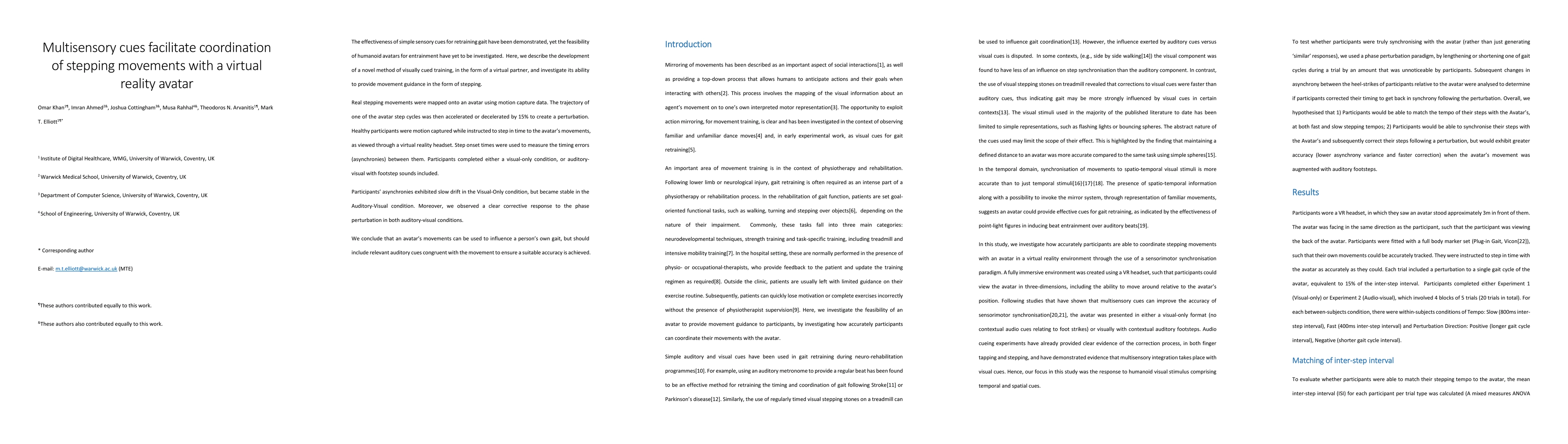 The effectiveness of simple sensory cues for retraining gait have been demonstrated, yet the feasibility of humanoid avatars for entrainment have yet to be investigated. Here, we describe the development of a novel method of visually cued training, in the form of a virtual partner, and investigate its ability to provide movement guidance in the form of stepping. Real stepping movements were mapped onto an avatar using motion capture data. The trajectory of one of the avatar step cycles was then accelerated or decelerated by 15% to create a perturbation. Healthy participants were motion captured while instructed to step in time to the avatar's movements, as viewed through a virtual reality headset. Step onset times were used to measure the timing errors (asynchronies) between them. Participants completed either a visual-only condition, or auditory-visual with footstep sounds included. Participants' asynchronies exhibited slow drift in the Visual-Only condition, but became stable in the Auditory-Visual condition. Moreover, we observed a clear corrective response to the phase perturbation in both auditory-visual conditions. We conclude that an avatar's movements can be used to influence a person's own gait, but should include relevant auditory cues congruent with the movement to ensure a suitable accuracy is achieved.