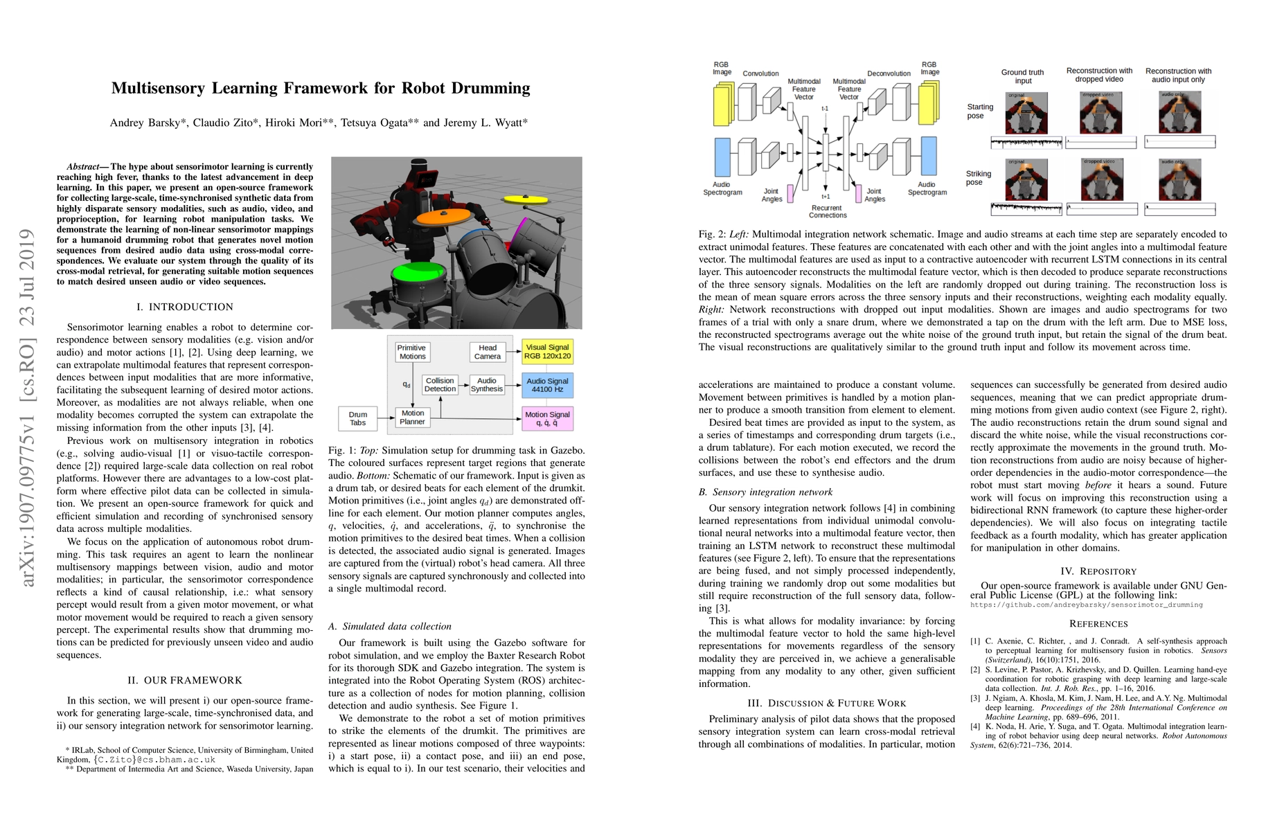 This paper introduces an open-source framework for collecting synchronized multisensory data to train robots in manipulation tasks, specifically demonstrating its application in a humanoid drumming robot that learns to generate new motion sequences from audio inputs. The effectiveness of the system is evaluated based on its ability to retrieve and match unseen audio or video sequences.